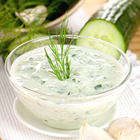 – původně řecký osvěžující předkrm z okurky, řeckého jogurtu, kopru, česneku a dalších ingrediencí, který může být i lehkou přílohou ke masovým pokrmům, třeba při domácí grilovačce na zahradě, chatě nebo na terase.