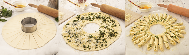Lisové těsto rozválejte do kruhu a uprostřed vykrajovačem nebo tvořítkem vykrojte kolečko. Pak stačí rádýlkem nařezat jednotlivé paprsky od vnější strany ke středu, jen dávejte pozor, abyste nedokrojili. Nasekané kopřivy a sýr rozprostřete po celé ploše těsta. Proužky stačí 2x nebo 3x přetočit, pomazat mašlovačkou rozkvedlaným žloutkem a dát na 15 minut péct na 180 °C do rozehřáté trouby.