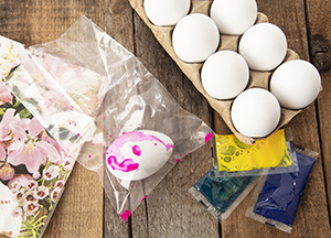 Zvlášť tady by „vejdumek“ (lidově vyfouklé vejce) určitě nepřežil opakované otevírání a zavírání dveří. Sada obsahuje 12 plastových vajíček, tekuté barvy a sáčky. V nich vajíčka obarvíte, "nabatikujete", aniž by byly barvy všude okolo.