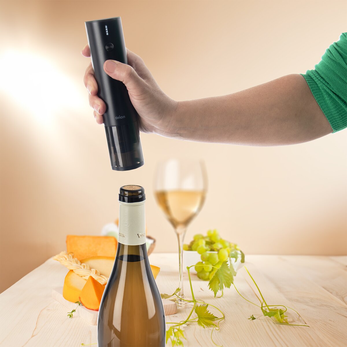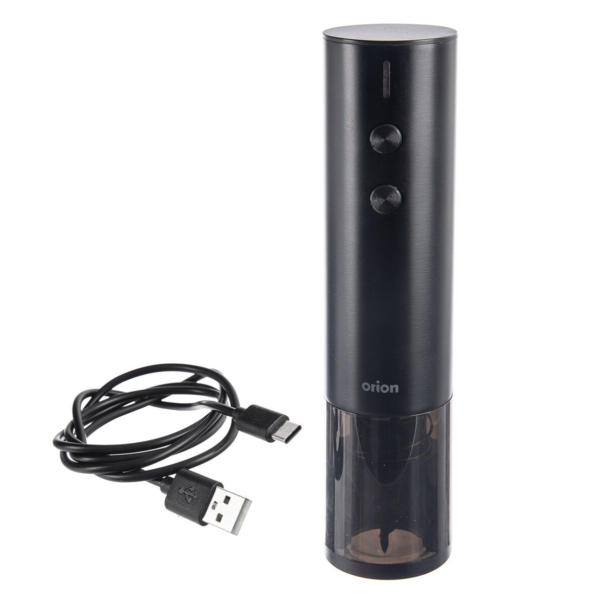 Dobíjí se pomocí USB-C kabelu o délce 1 m, který je součástí výrobku. Není tedy potřeba do vývrtky vkládat žádné baterie, což šetří vaše finance. Spodní část-stojan slouží jako řezačka pro odstranění fólie na hrdle láhve. Při spuštění vývrtky svítí bílé LED světlo, které je současně ukazatelem míry nabití baterie (čím méně je vývrtka nabitá, tím méně kontrolek v LED osvětlení svítí).