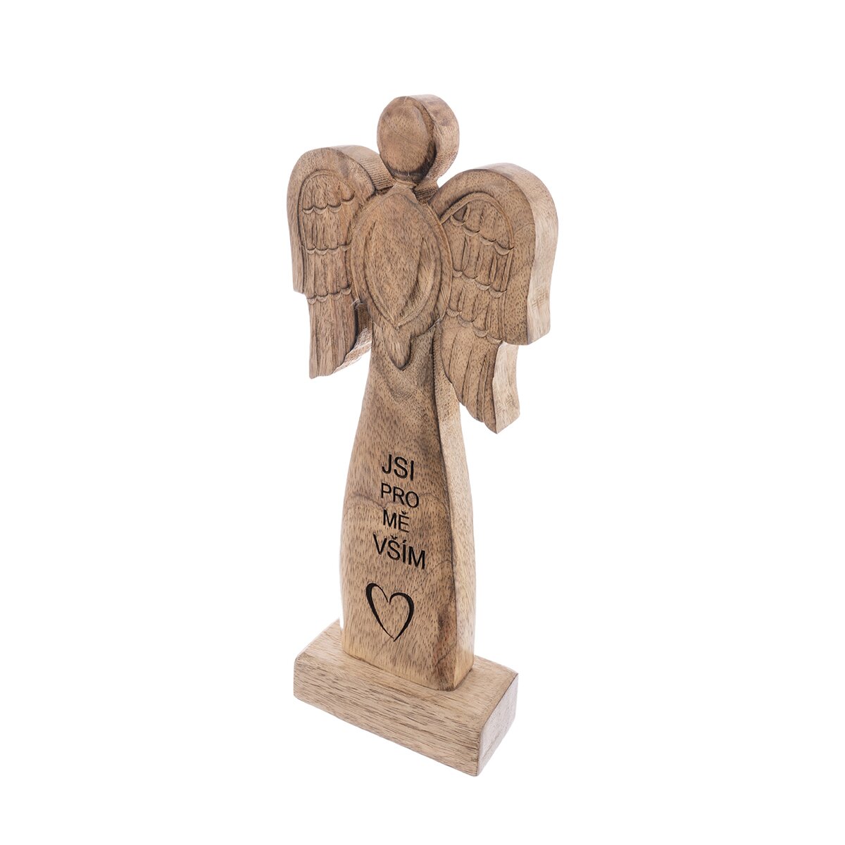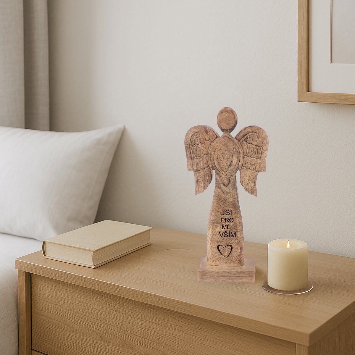 Na přední straně anděla je nápis „Jsi pro mě vším“, který dodává celé dekoraci hluboký osobní význam a činí z ní krásný dárek pro výjimečného člověka. Anděl je vyroben z mangového dřeva a jeho výška je 30 cm.