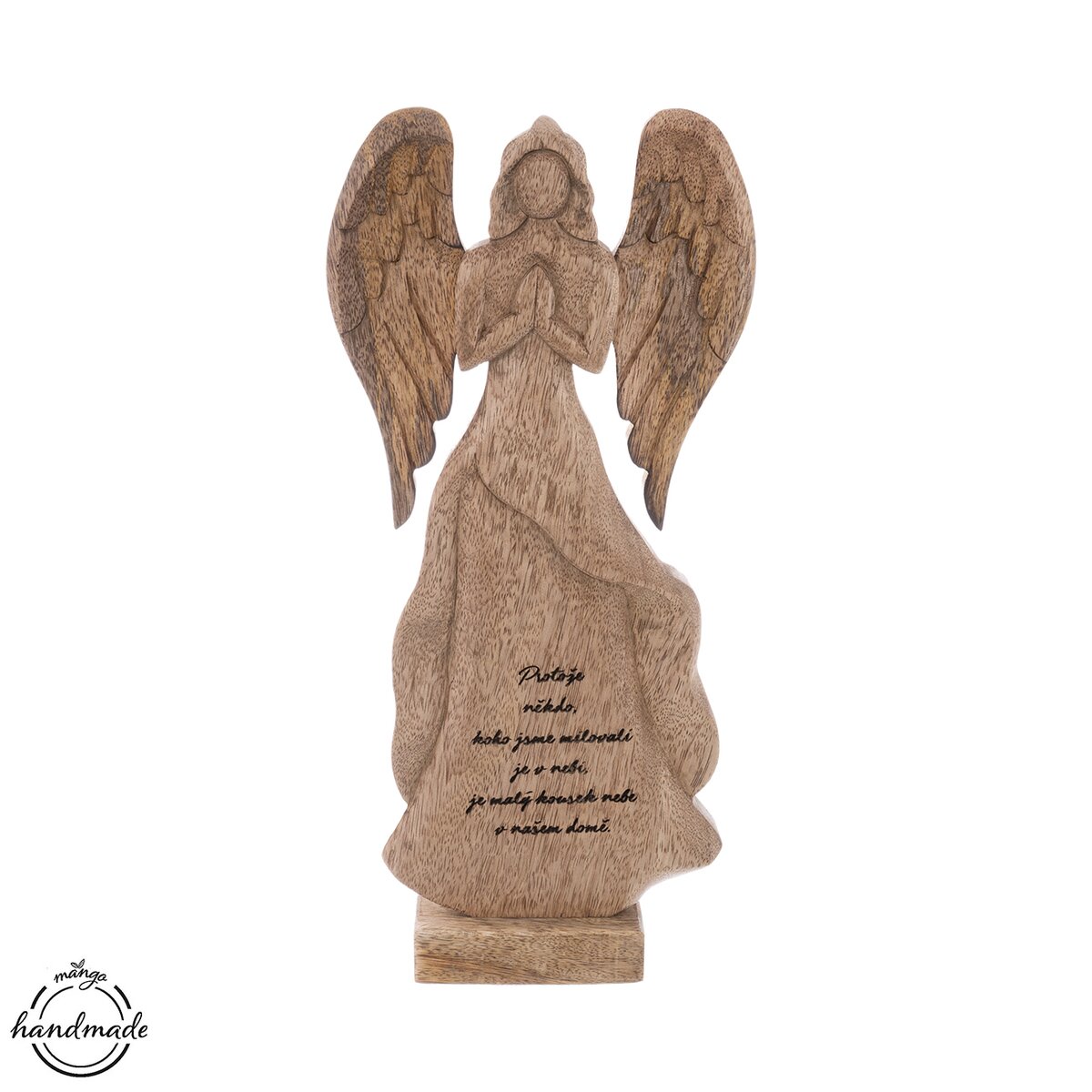 Více informacíAnděl z přírodního mangového dřeva vnese do vašeho domova dotek vzpomínek, lásky a klidu. Tato nádherná dekorace okouzlí svým jednoduchým, ale zároveň silně působivým designem, který podtrhuje přirozená kresba dřeva. Každý anděl je originál – díky ručnímu zpracování a přírodnímu materiálu. Krásný a smysluplný doplněk domova.