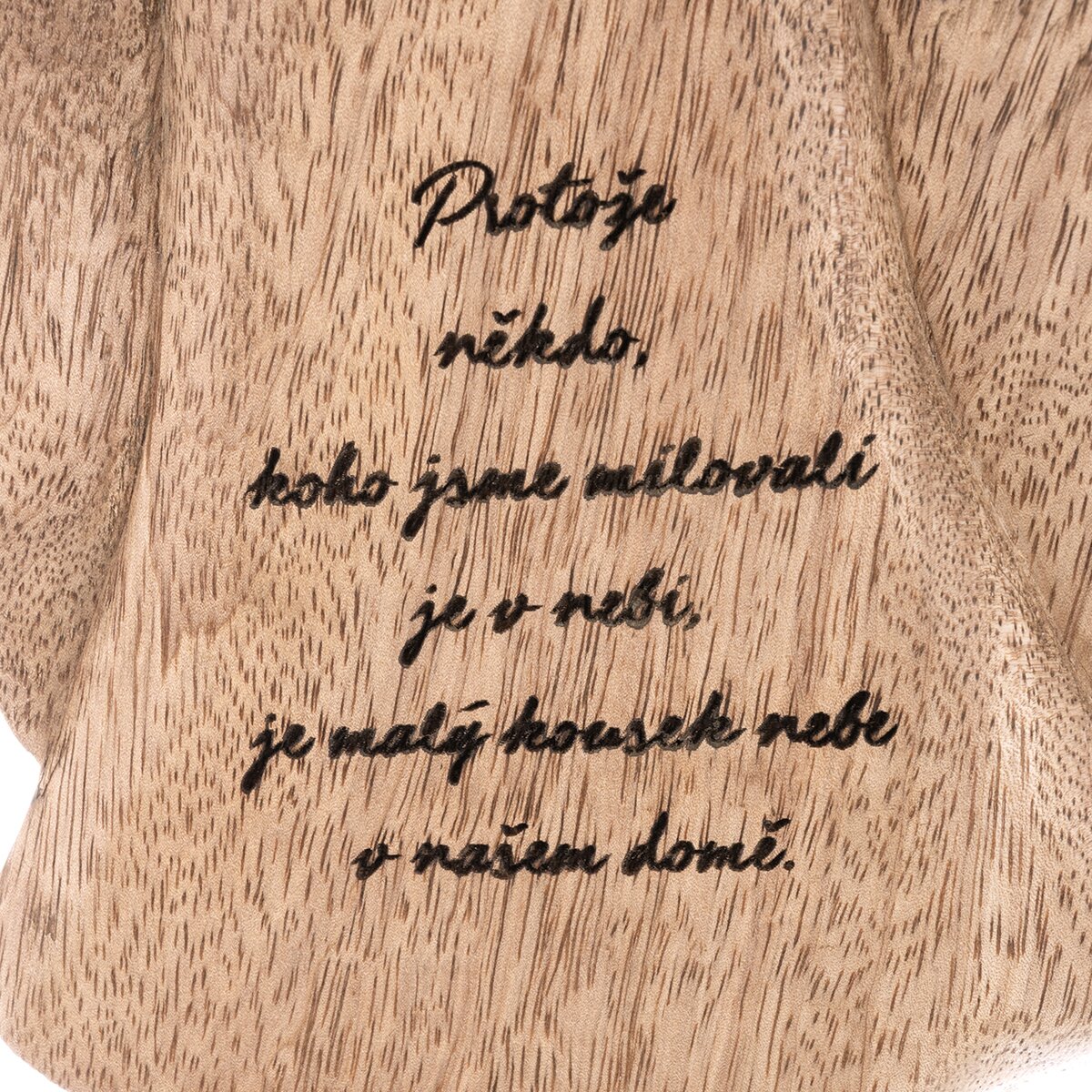 Na přední straně anděla je nápis „Protože někdo, koho jsme milovali, je v nebi, je malý kousek nebe v našem domě“, který dodává dekoraci hluboký osobní význam a přináší jemné připomenutí těch, kteří už nejsou s námi – ale stále zůstávají v našich srdcích. Tento anděl je nejen krásným doplňkem interiéru, ale i symbolem lásky, která nikdy neumírá. Anděl má na výšku 36 cm.