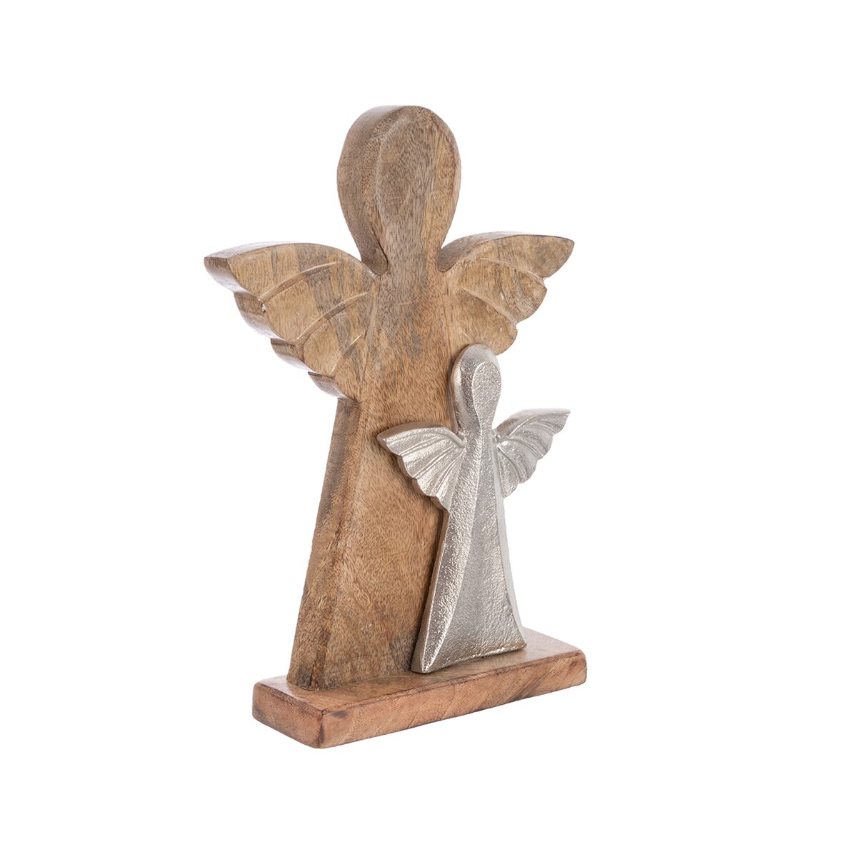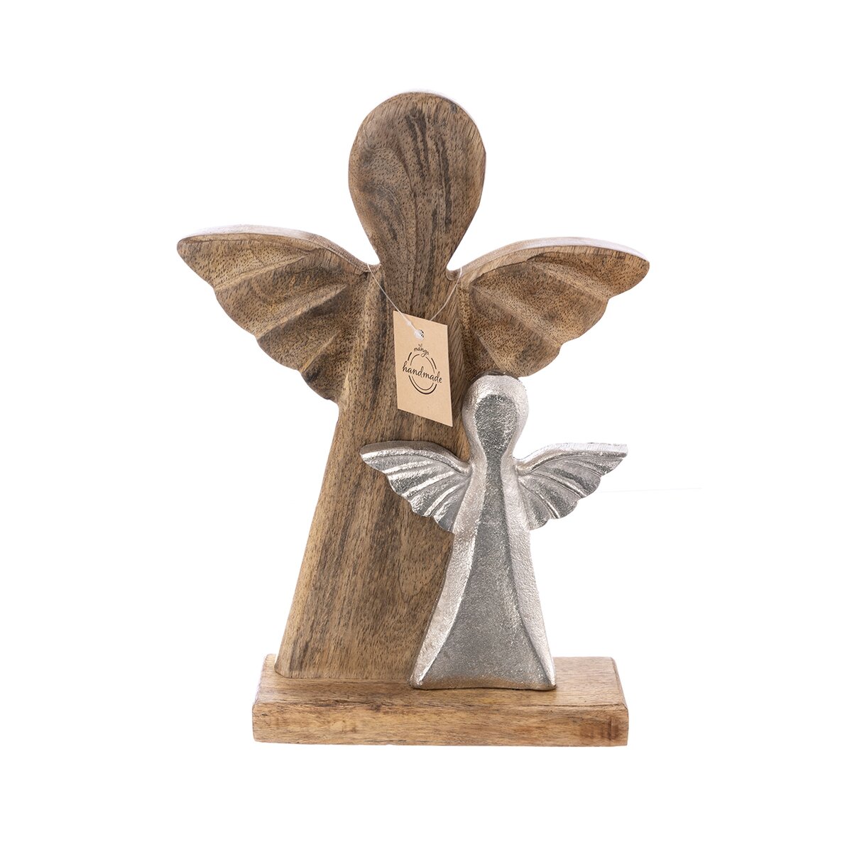 Tato stylová dekorace anděla je vyrobená z mangového dřeva a doplněná menším kovovým andělem se šířkou 14 cm a výškou 17,5 cm, se kterým tvoří elegantní a harmonický celek. Díky svému originálnímu designu se skvěle hodí jako vkusný doplněk do interiéru, ale potěší i jako milý dárek.