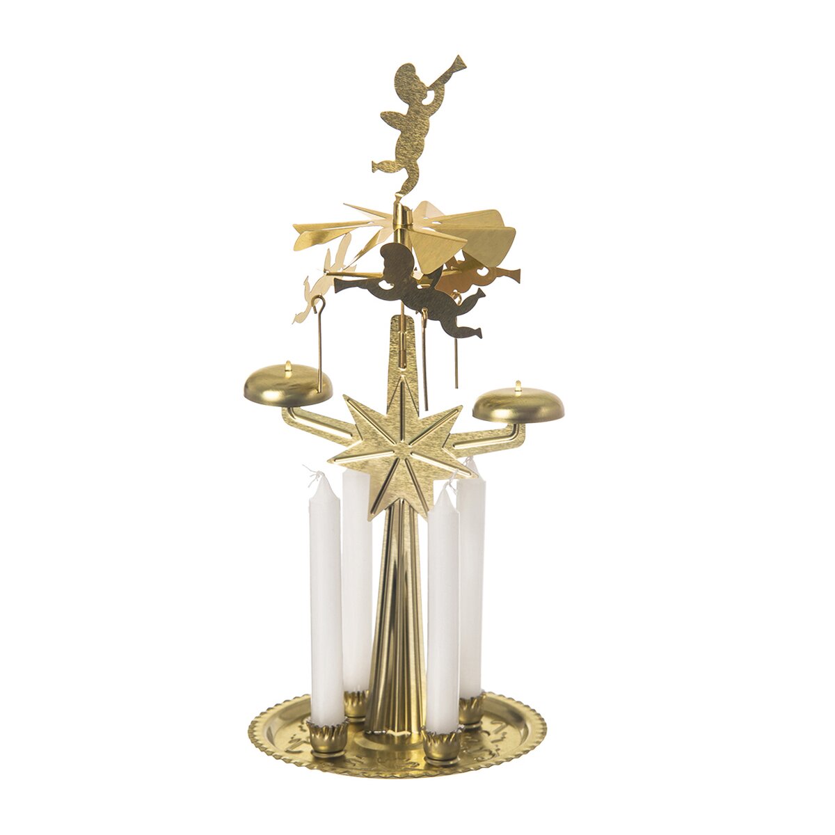 Tato vánoční dekorace výšky 27 cm, vyrobená z pozinkované oceli, je složena z několika částí. Na základně jsou uchyceny 4 bílé svíčky, které po zapálení roztočí horní část s pletujícími andílky. Ty jsou součástí balení.