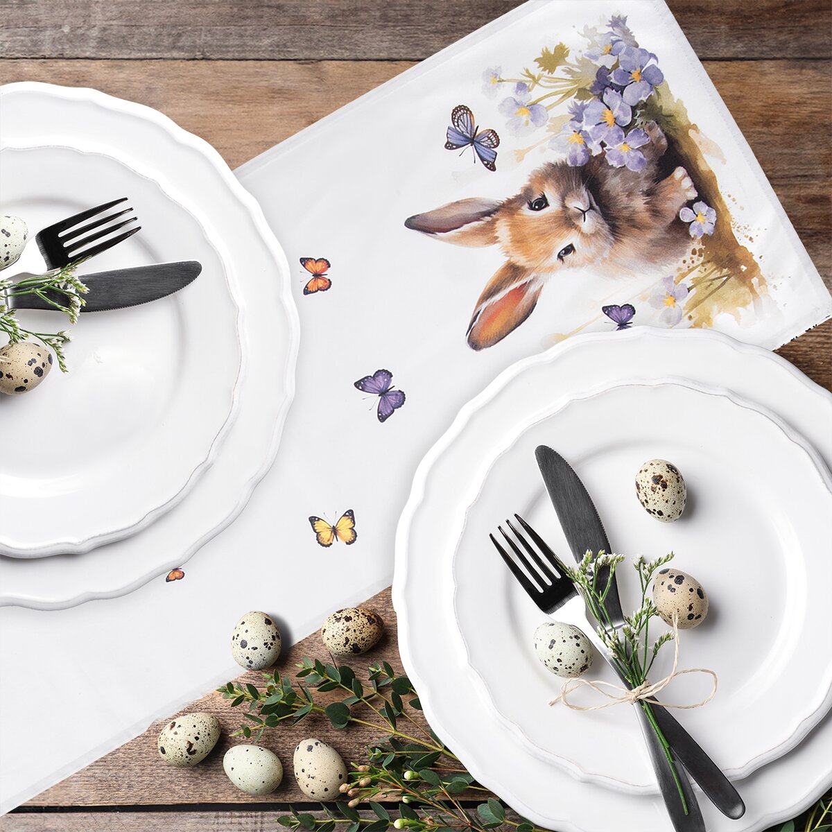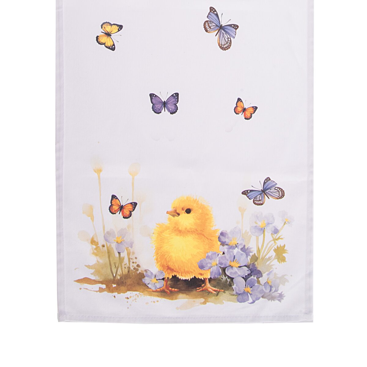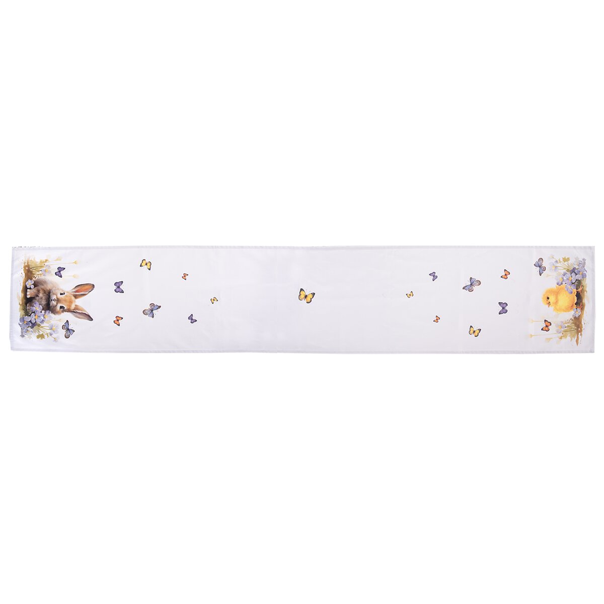 Kód produktu 728078Delší bílý běhoun s motivem zajíčka, kuřátka a poletujících motýlků je vyroben ze 100% bavlny a ozdobí jarně vyladěný stůl v kuchyni, jídelně i obývacím pokoji.
