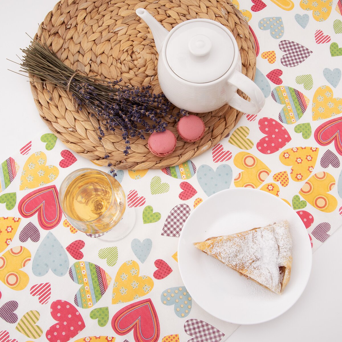 Kód produktu 728086Papírový běhoun o rozměru 180x40 cm zdobí dekor barevných srdíček a vytvoří základ pro hezky prostřený stůl doma, na terase i na zahradě.