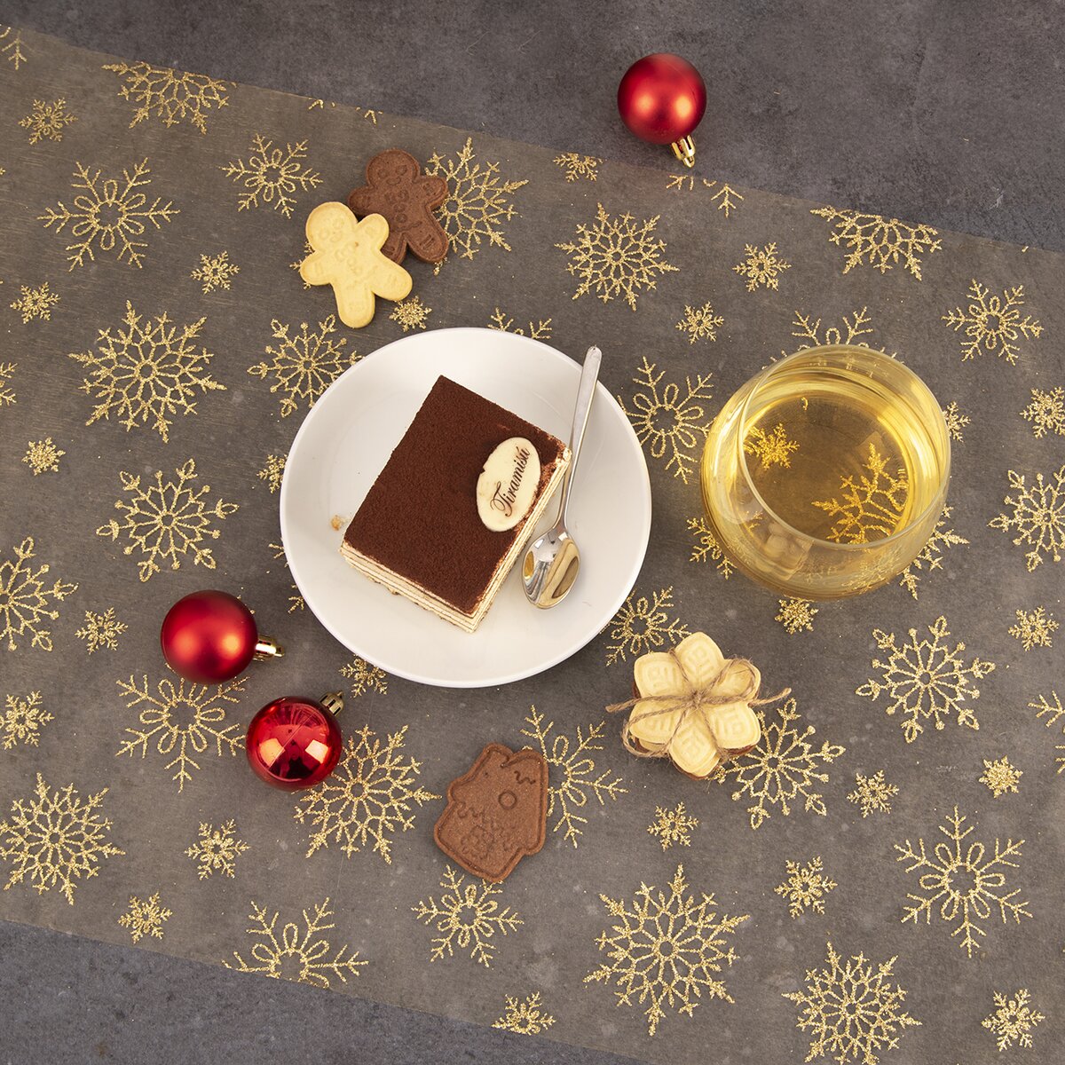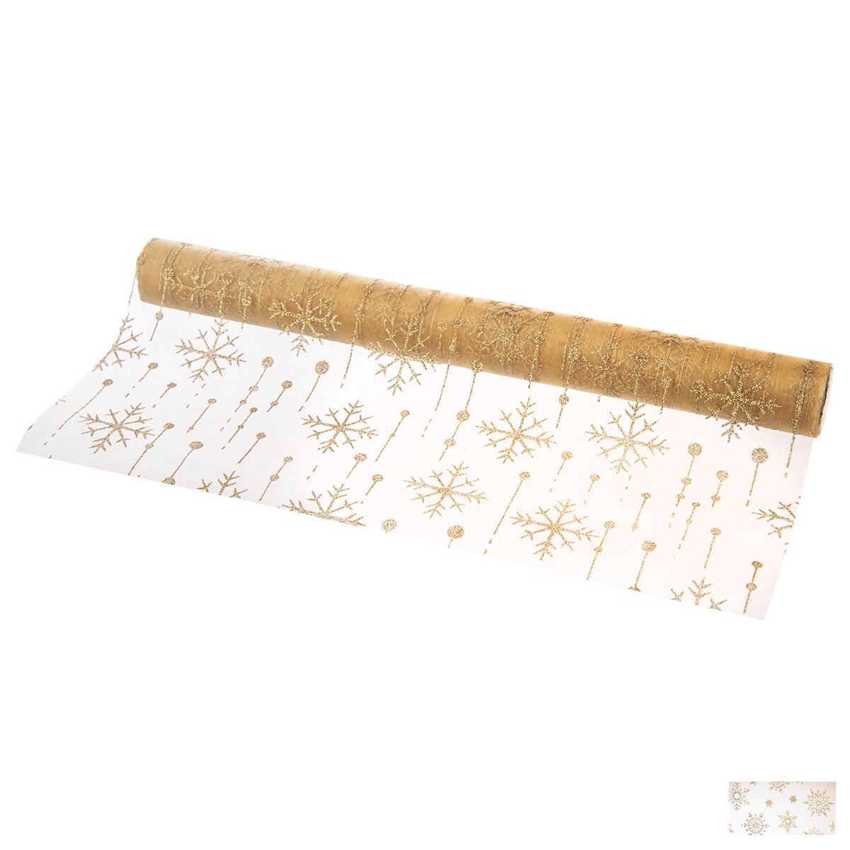 Kód produktu 728040Průhledný běhoun s motivem třpytivých zlatých vloček, vyrobený z polyesteru, je určen na střed stolu. Ozdobí sváteční stůl v kuchyni, jídelně i obývacím pokoji.