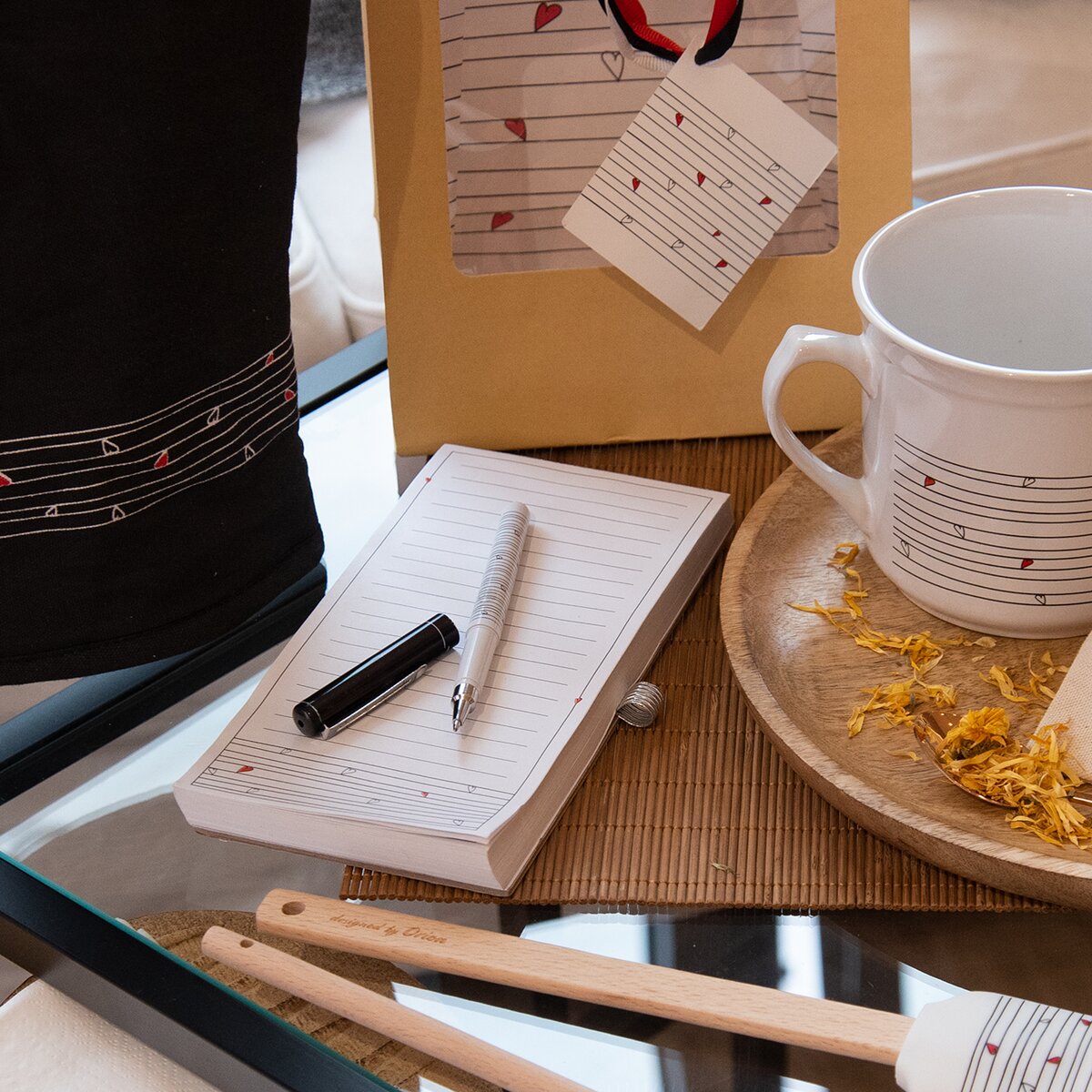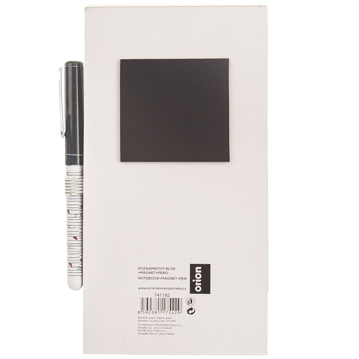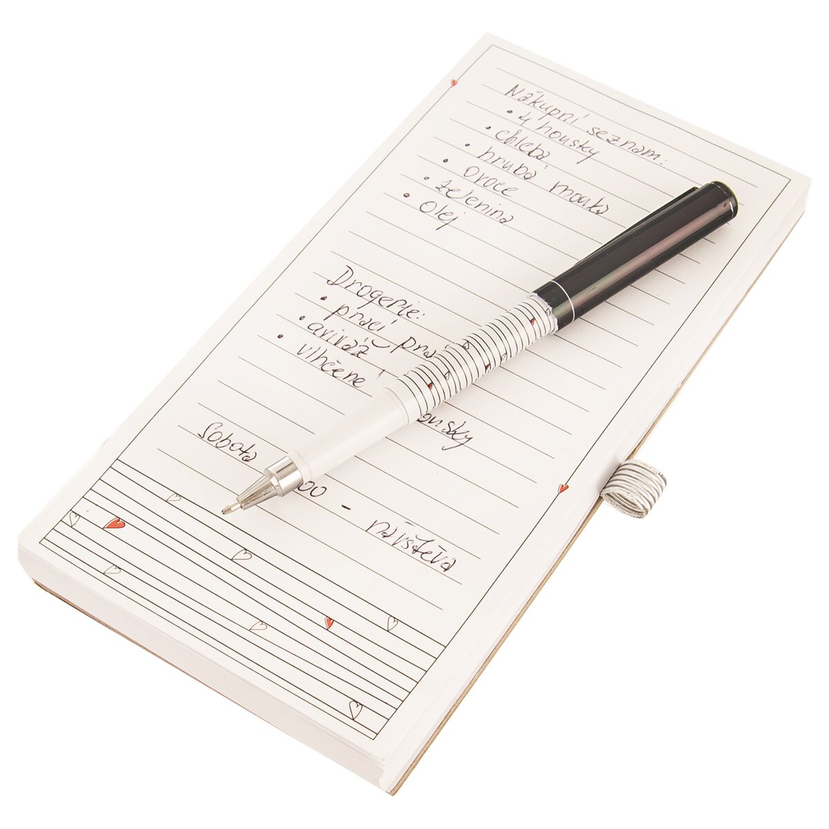 Kód produktu 741182Poznámkový linkovaný blok s drobnými srdíčky a propiskou můžete mít v kuchyni pohodlně při ruce, pokud využijete magnetu na jeho zadní straně a připevníte ho na lednici nebo jinou kovovou plochu. Využijete jej na soupis nákupu i pro úkoly nebo vzkazy.