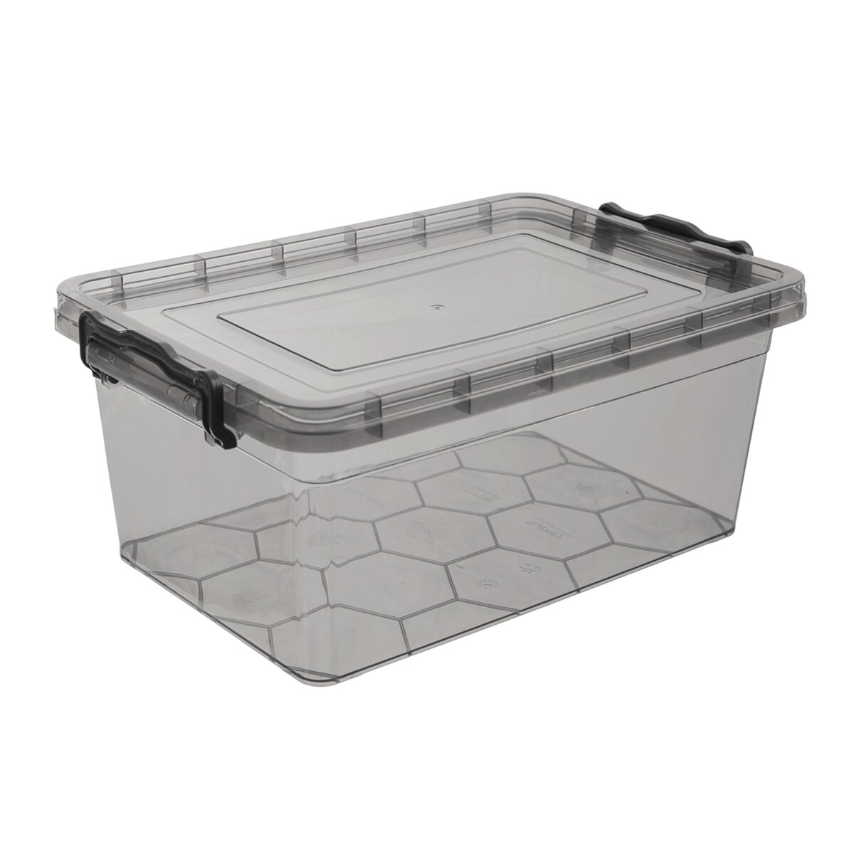 Kód produktu 127312Kouřově zabarvený plastový box GREY o objemu 9 l, s víčkem a uzavíráním na dva klipy, vhodný k uložení potravin, drobností v koupelně, dílně i pokoji a k jejich přenášení.