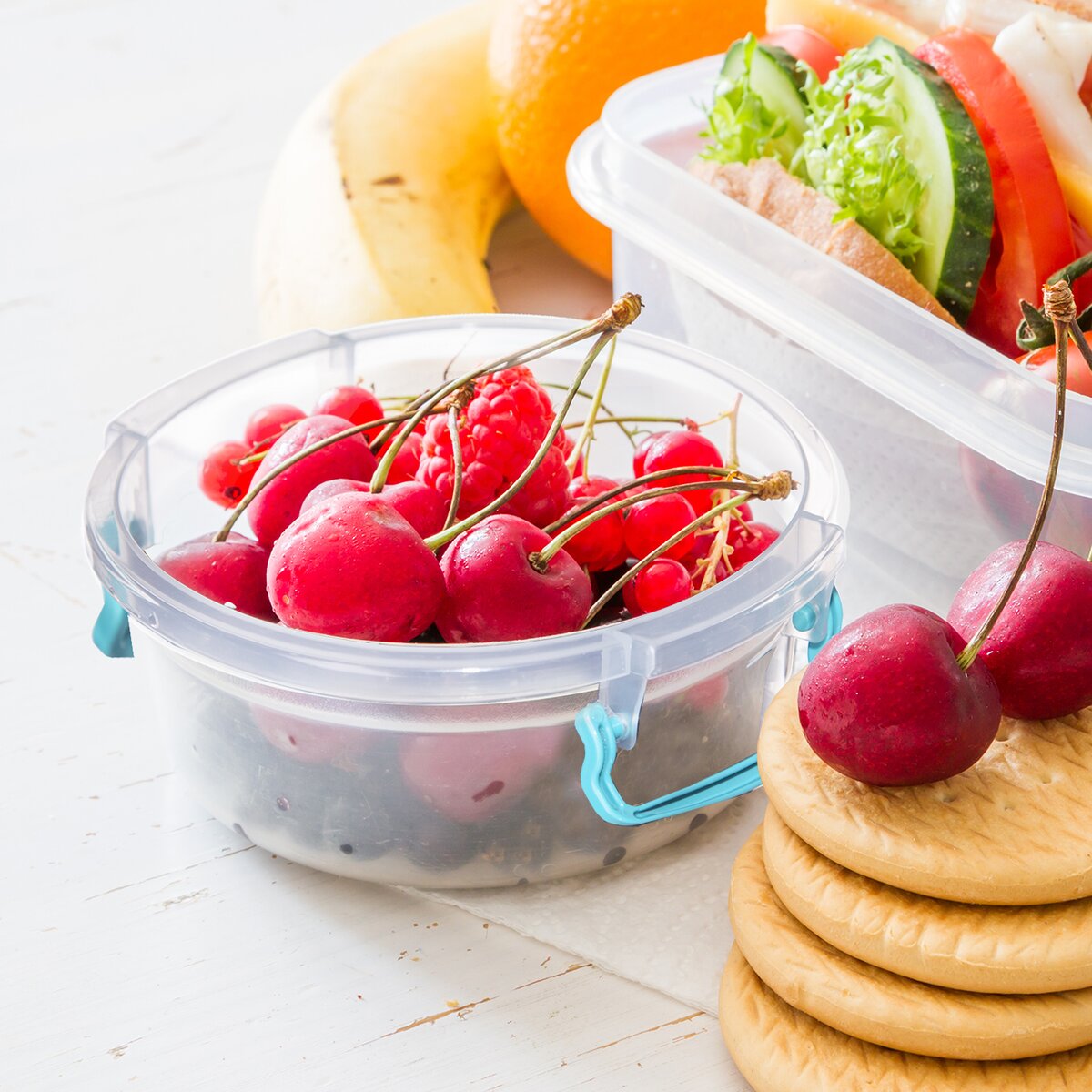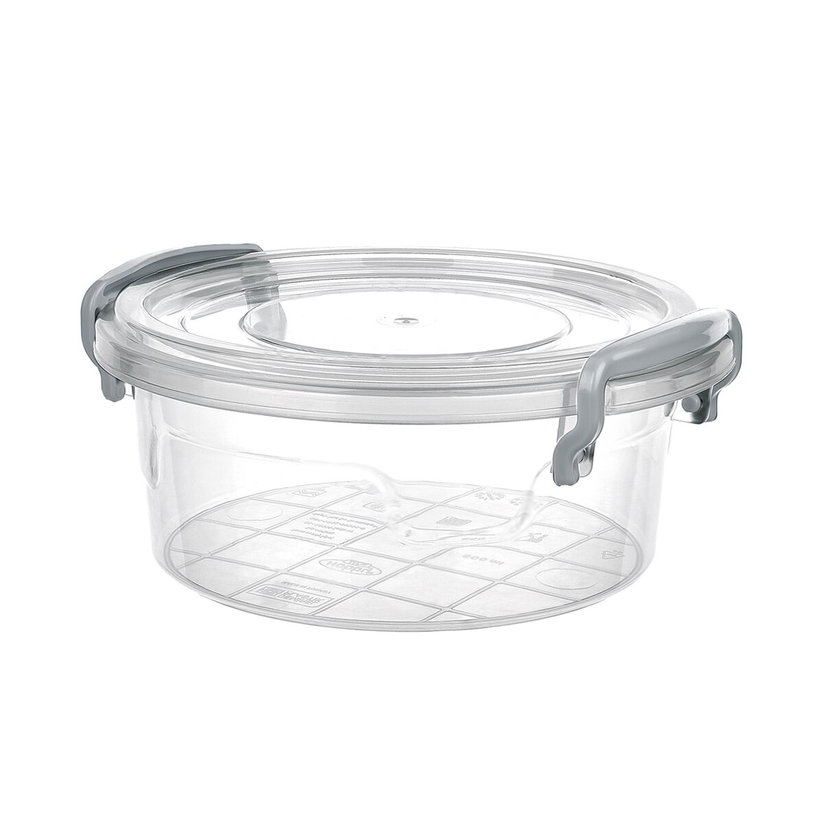 Kód produktu 124635Plastový kulatý box o objemu 1,2 l s víkem a dvěma klipy.