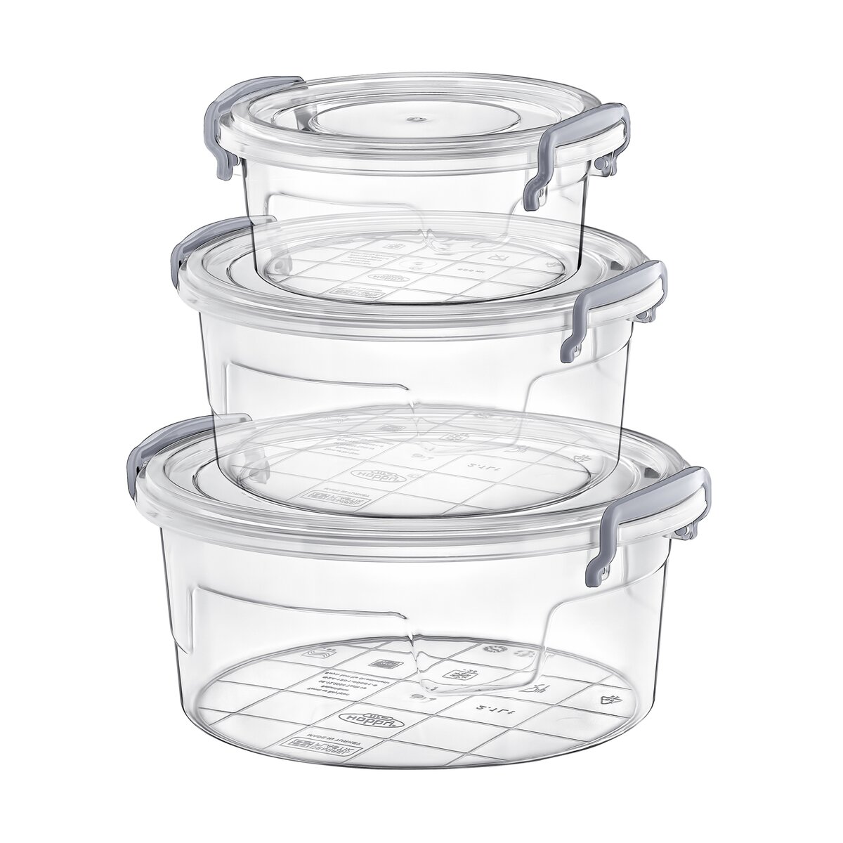 Kód produktu 124636Plastový kulatý box o objemu 2,1 l s víkem a dvěma klipy.