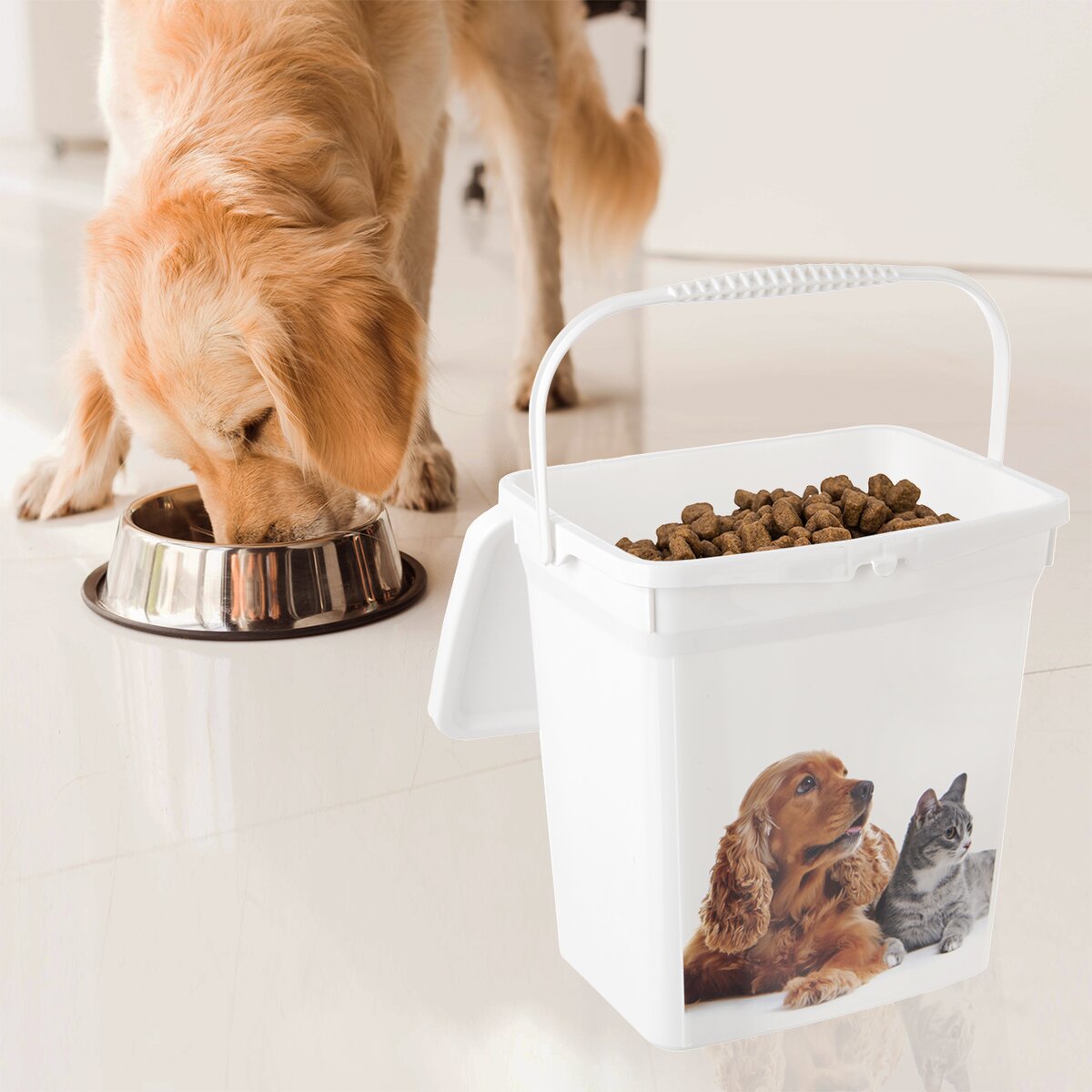 Kód produktu 154041Plastový zásobník s víkem, držadlem a potiskem, o objemu 6 litrů, je určen k uložení granulí a jiného krmení pro domácí mazlíčky.