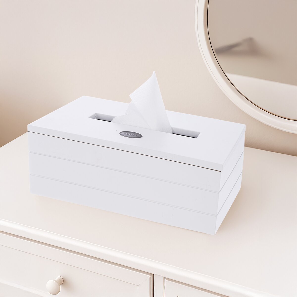 Stačí víko s kovovými panty u boxu z dřevovláknité desky MDF otevřít a vložit dovnitř obdélníkovou krabičku kapesníků. V horní části je opatřen dostatečně velkým otvorem, abyste je mohli pohodlně vytahovat. Je praktický a dekorativní zároveň, ať už jste doma, v kanceláři nebo v provozovně.