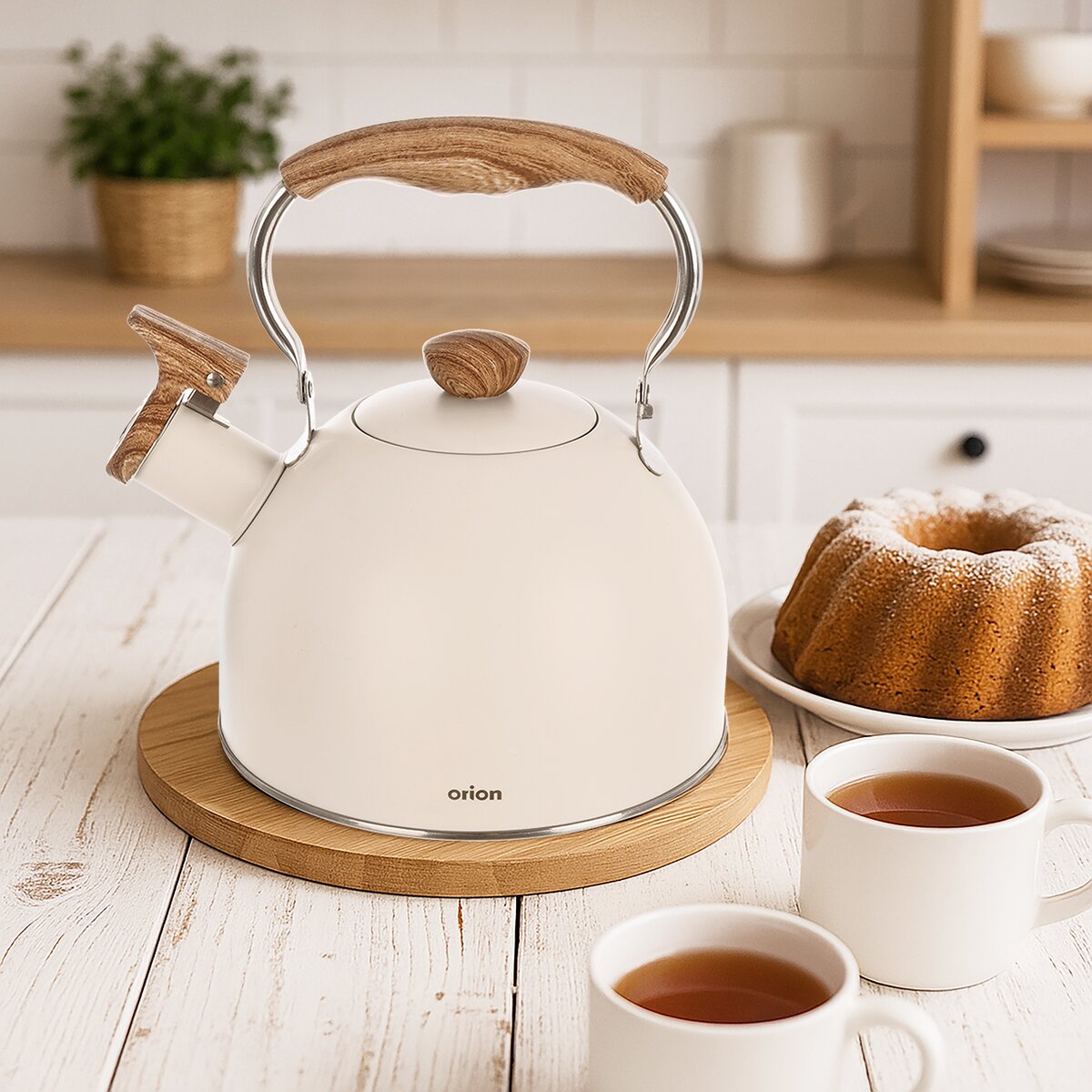 Kód produktu 113527Moderní béžový nerezový čajník o objemu 1,5 l s odklápěcí píšťalkou, rukojetí a držadlem víčka s designem dřeva. Je vhodný k ohřevu vody na všech typech sporáků včetně indukce.