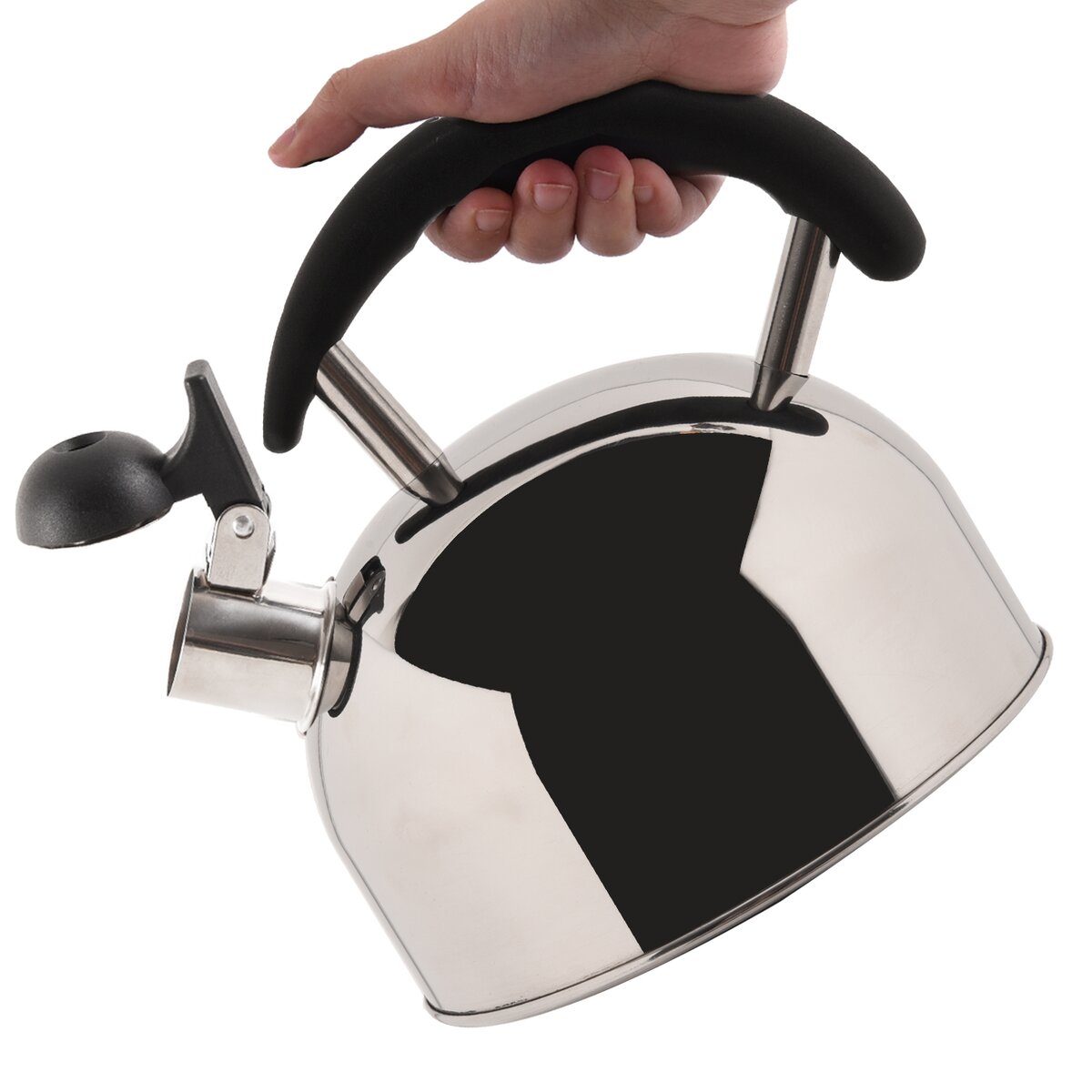 Kód produktu 111995Moderní nerezový čajník o objemu 1,3 l s odklápěcí píšťalkou a zajímavě řešenou černou plastovou rukojetí. Je vhodný k ohřevu vody na všech typech sporáků včetně indukce.