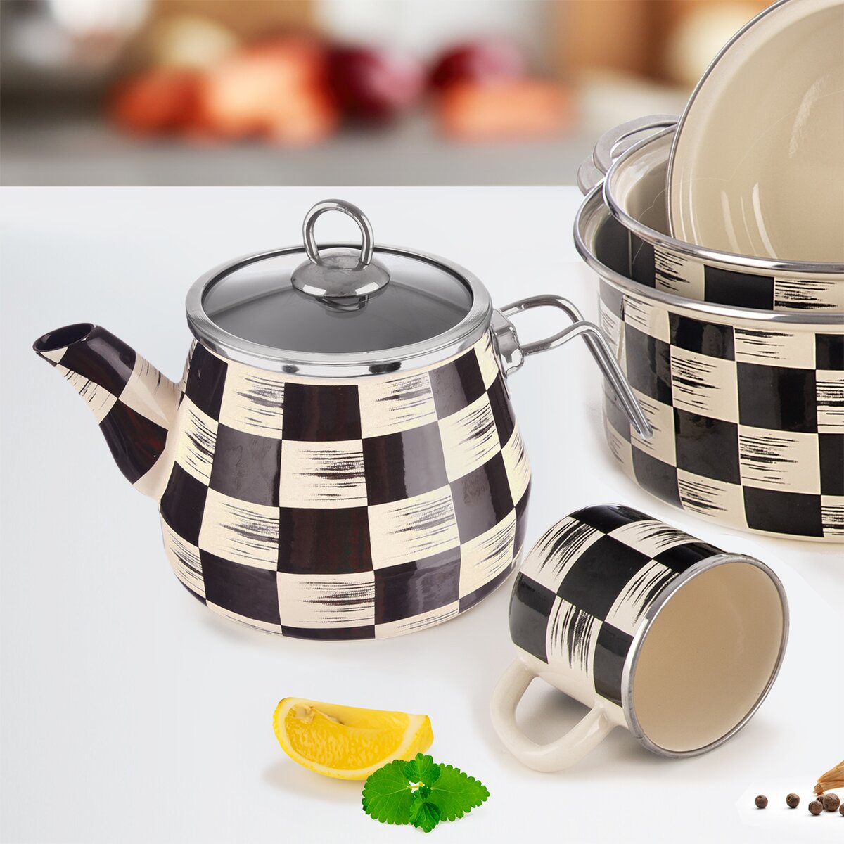 Kód produktu 113523Smaltovaný čajník ŠACHOVNICE o objemu 2 l je vhodný k ohřevu vody na všech typech sporáků včetně indukce.