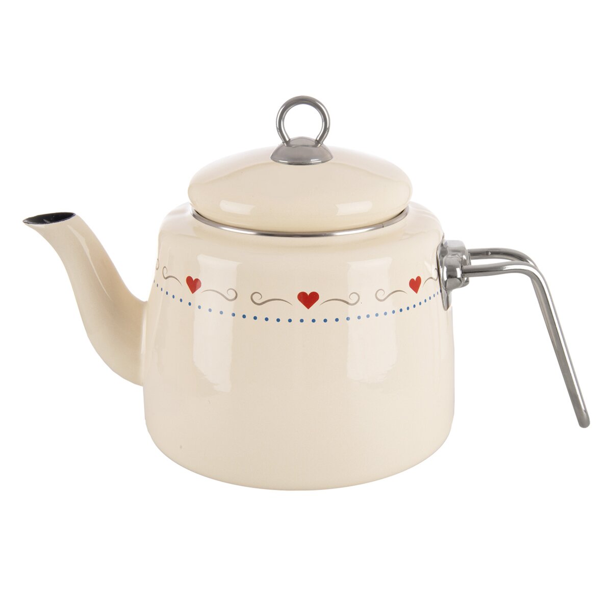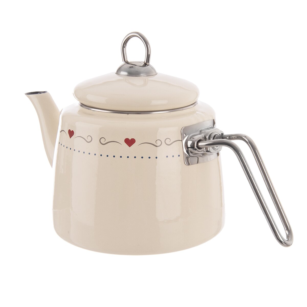 Ocelový základ je pokryt smaltem, což je tavenina podobná sklu a vytvoří tak odolný, zcela zdravotně nezávadný povrch. Čajník o užitném objemu 1,8 l je doplněn nerezovým lemem a kovovým držadlem.
