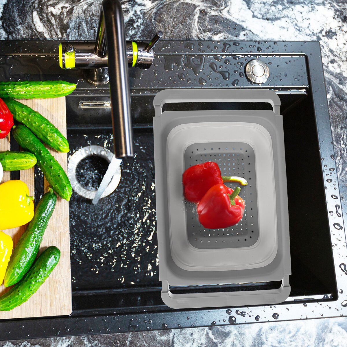 Vysunovací madla nabízí nastavitelnou délku od 39 cm do 55 cm, pohodlně se pak cedník položí na hrany různě velkých dřezů. Je vyroben z PP plastu a TPE (silikonu), má objem 5,5 l, takže např. i nakopané brambory ze zahrádky pohodlně umyjete. Lze jej mýt v myčce nádobí.