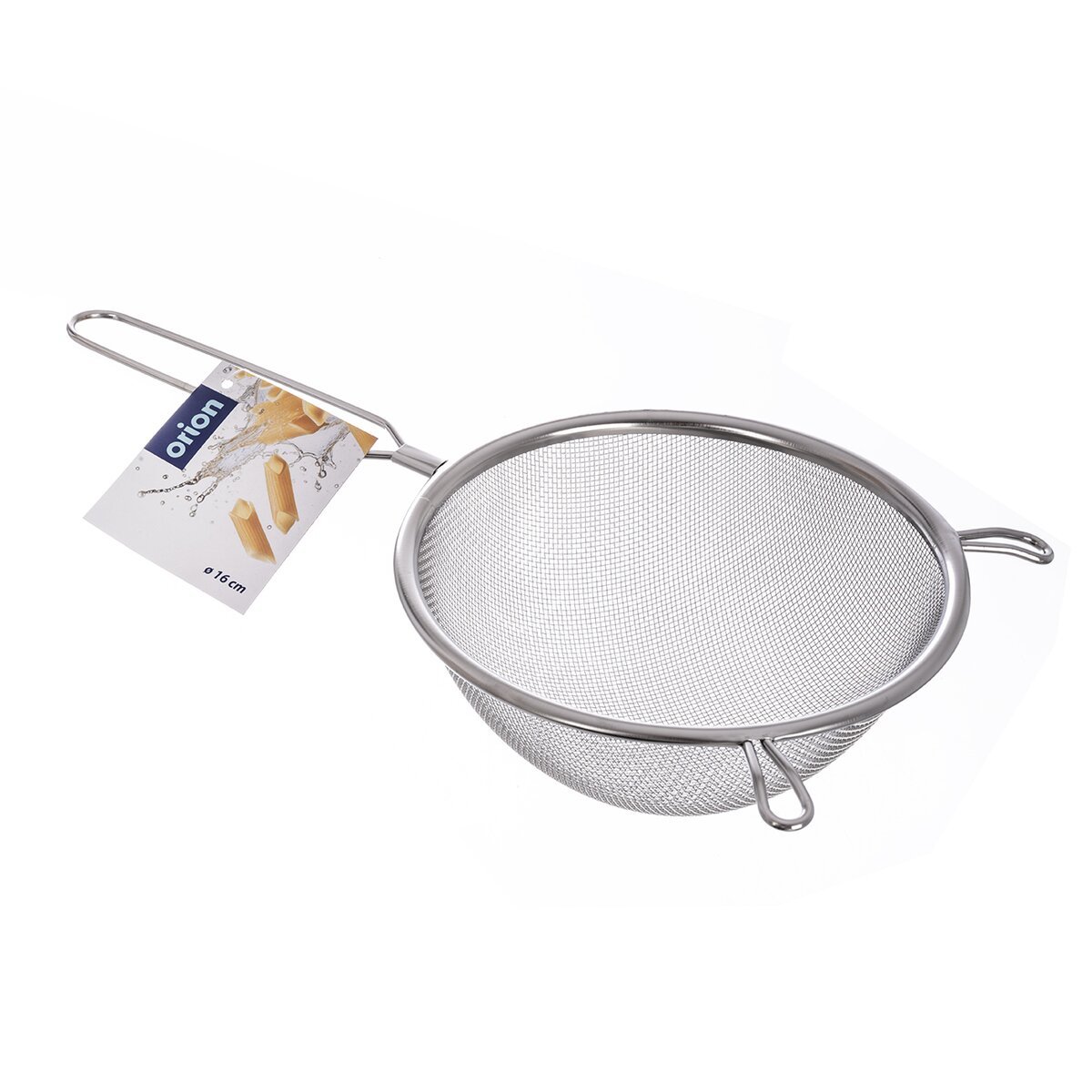 Kód produktu 124434Nerezový cedník o průměru 16 cm s jemnou síťkou, delší rukojetí a dvěma zarážkami.