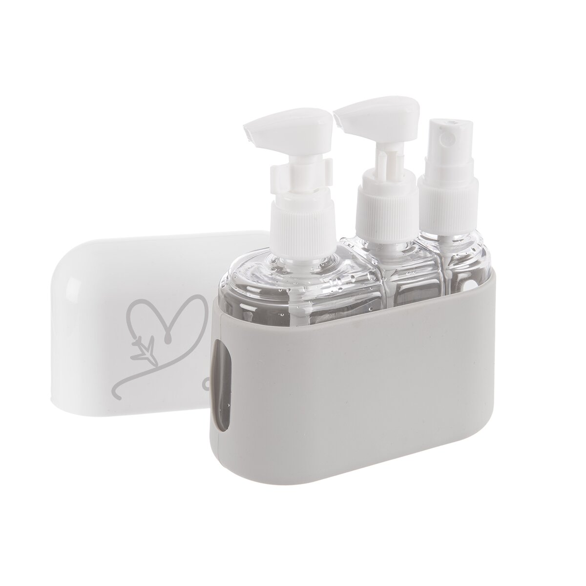 Kód produktu 811258Souprava 2 transparentních lahviček s dávkovačem a 1 rozprašovače v praktickém pouzdru o rozměru 10x5x12 cm, určených k uložení menšího množství kosmetických přípravků na cesty či dovolenou.
