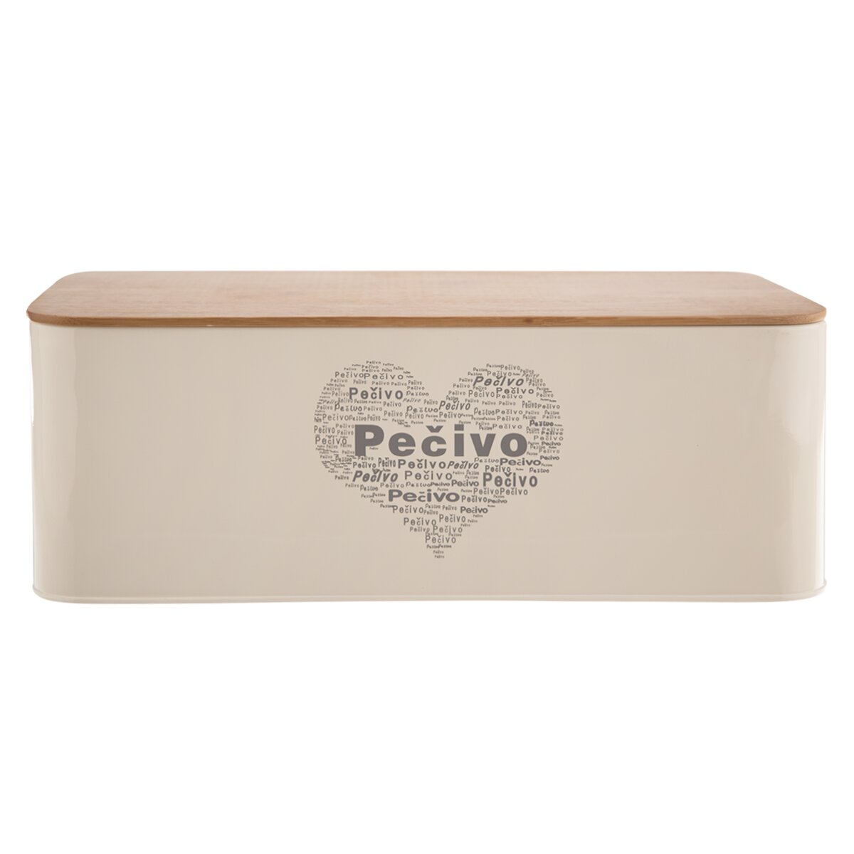 V případě této plechové chlebovky, která slouží k uskladnění chleba, rohlíků nebo housek, je hlavním nápisem slovo PEČIVO. Součástí je i dřevěné víčko, které můžete využít zároveň jako kuchyňské prkénko na krájení nebo jako podložku pod horký hrnec.
