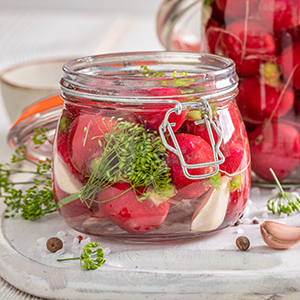Co takhle zkusit kvašené ředkvičky, plné vitamínů skupiny B a C? Jsou zdrojem bakterií mléčného kvašení, takže výborně nahradí probiotické tablety z lékárny. A přitom je to tak jednoduché. Stačí omyté ředkvičky nakrájet na čtvrtky či poloviny a zalít vodou svařenou se solí. Ideální jsou k tomu sklenice s kovovým klipovým uzávěrem. Pak sklenici umístěte na stinné místo v kuchyni a nechte 3 dny fermentovat. Ve chvíli, kdy lák získá mléčné zabarvení, jsou ředkvičky připravené ke konzumaci. Jsou výborné k masu nebo do salátů.