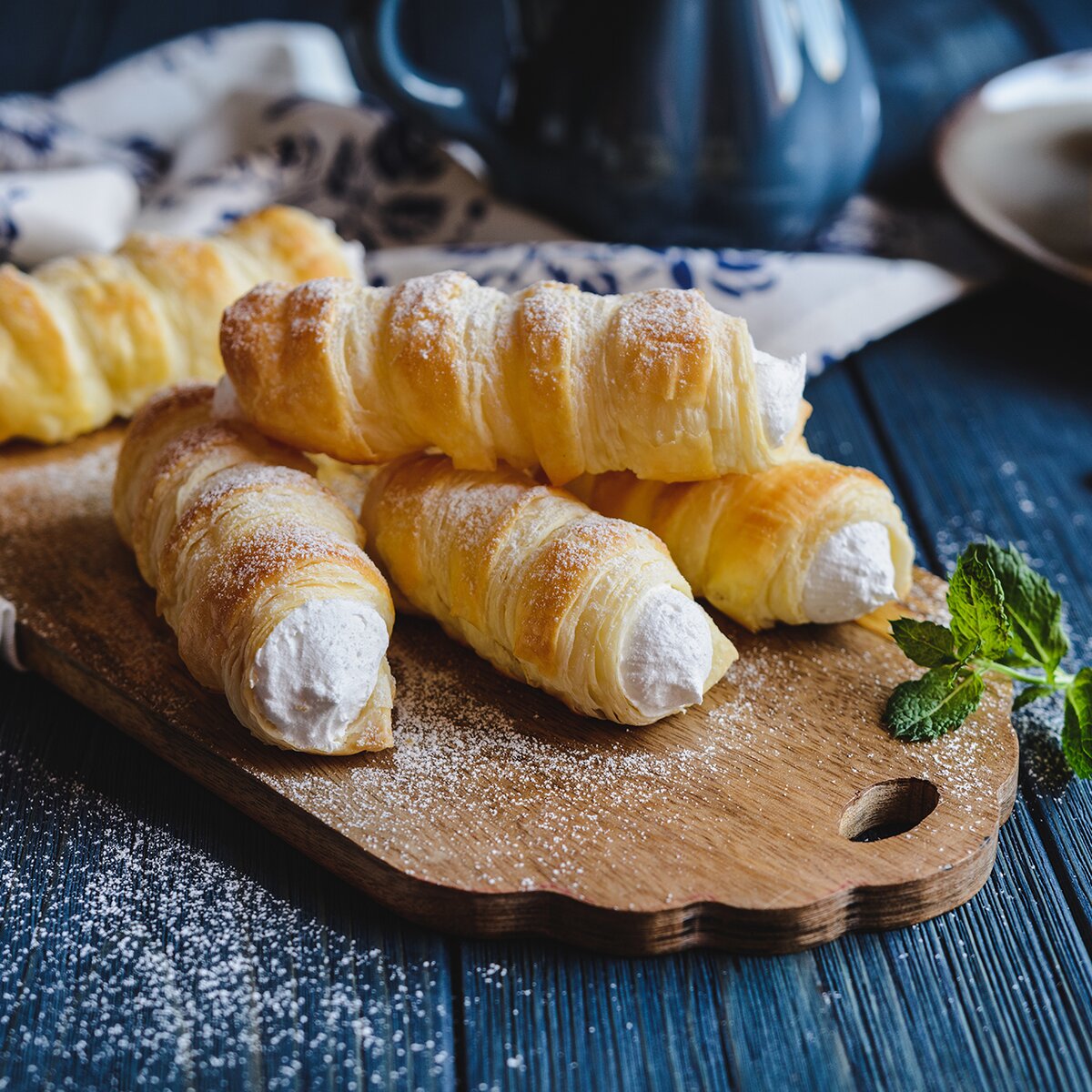 Vyválené pláty listového těsta navineme na zužující se kovové trubičky lehce potřené olejem tak, aby se překrývaly. Pak stačí upéct dozlatova.