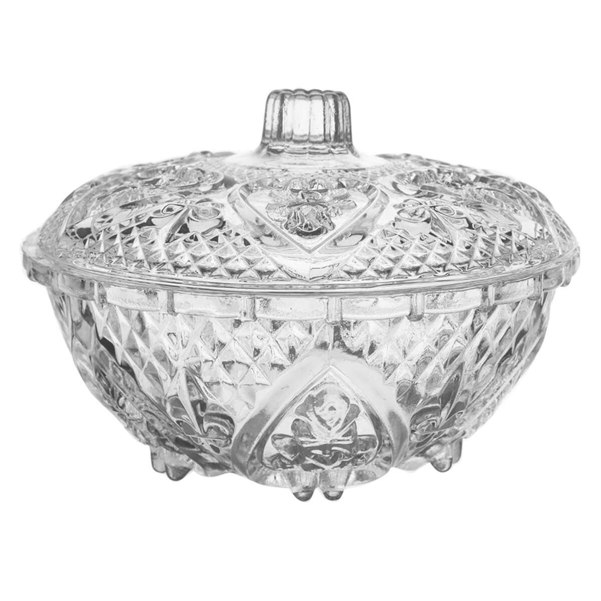 Kód produktu 126713Silnostěnná skleněná cukřenka s protlačovaným dekorem k uložení kostkového nebo krystalového cukru.