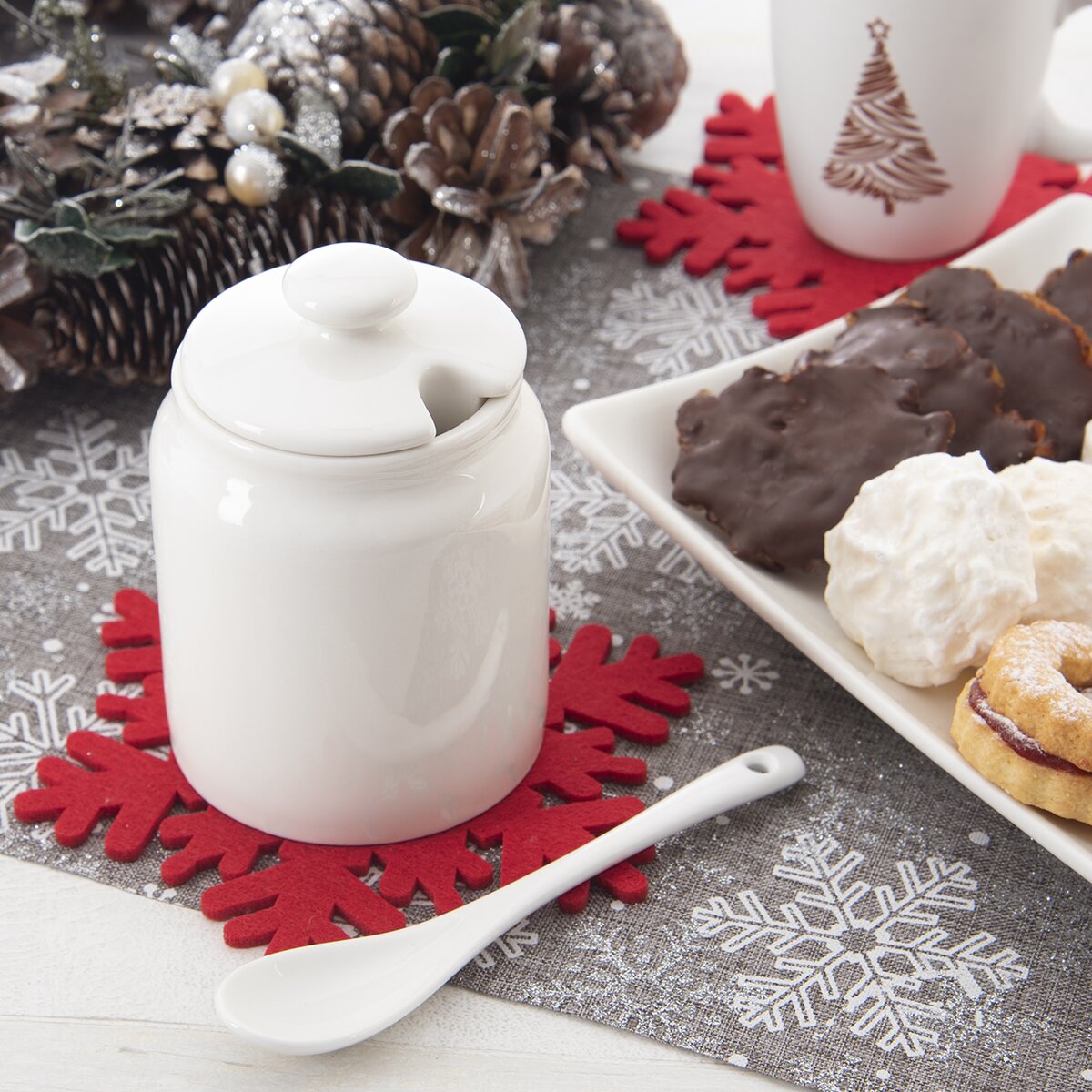 Elegantní, bílá cukřenka s víčkem a lžičkou se hodí do klasické, moderní i rustikální kuchyně. A pokud servírujete na bílém porcelánu kávu a moučník, podtrhne tato decentní cukřenka celkový příjemný dojem ze stolování.