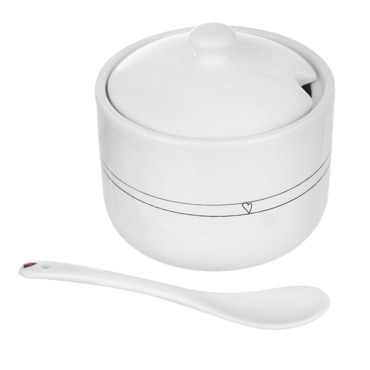 Kód produktu 155401Bílá keramická cukřenka s vloženou lžičkou a víčkem s výřezem pro příjemné podávání kávy i čaje. Zdobí ji jemný dekor linek se srdíčky.