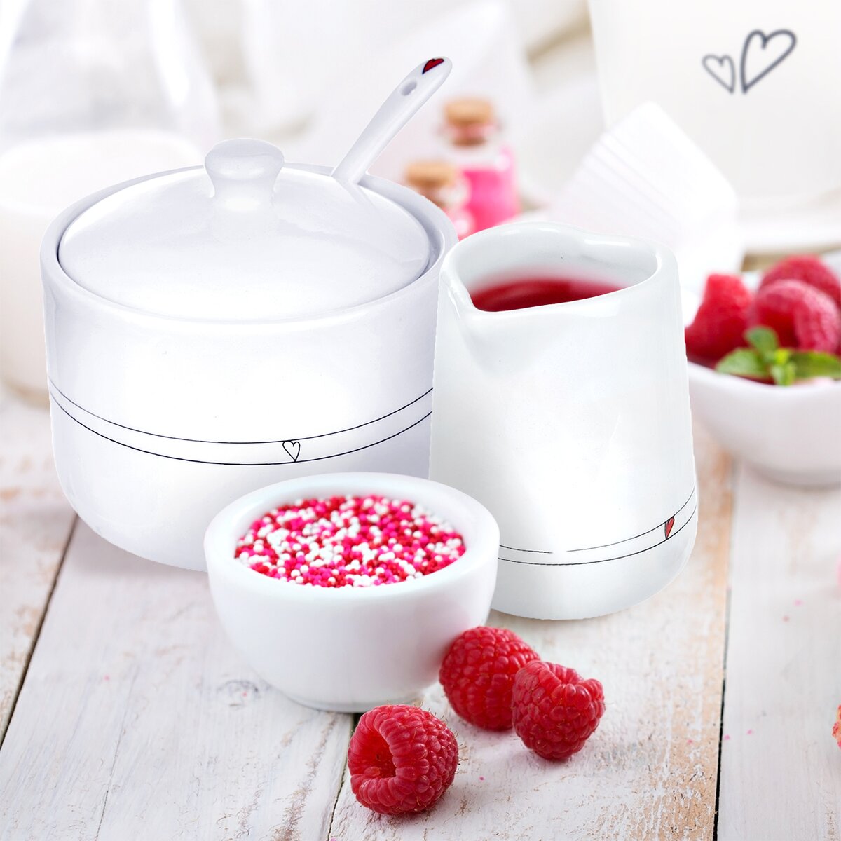 Elegantní, bílá keramická cukřenka s víčkem a lžičkou se hodí do klasické, moderní i rustikální kuchyně. Společně s bílými šálky a podšálky podtrhne tato cukřenka příjemný dojem ze stolování, třeba společně z dalšími kousky z kolekce SRDÍČKA. Cukřenka s jemným dekorem srdíček usnadní podávání krystalového cukru nebo kostek, protože není nic lepšího, než si osladit trochu život.