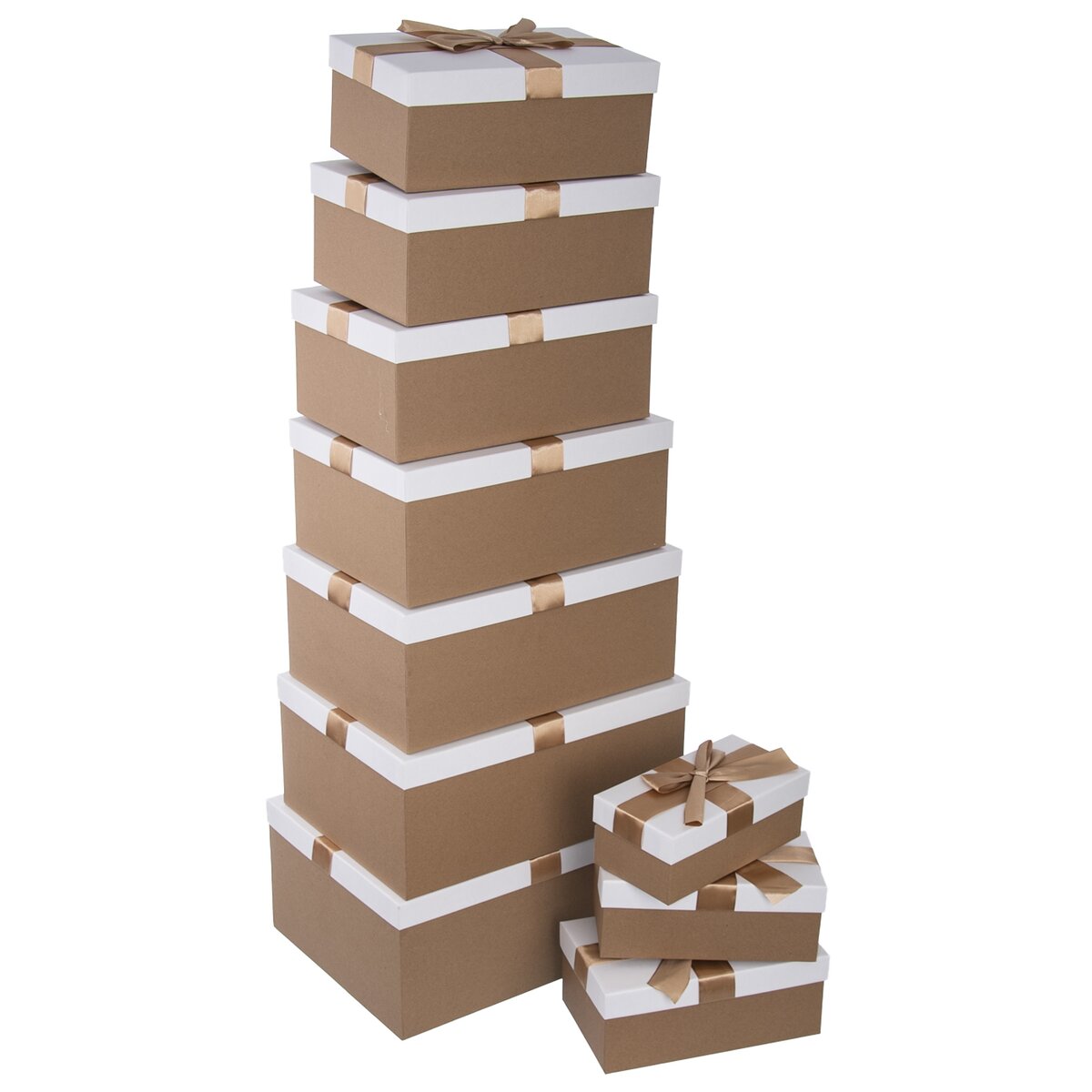 Kód produktu 822695Sada deseti bílo-zlatých dárkových krabic s víkem a dekorační stuhou. Každá krabice má jiný rozměr.
