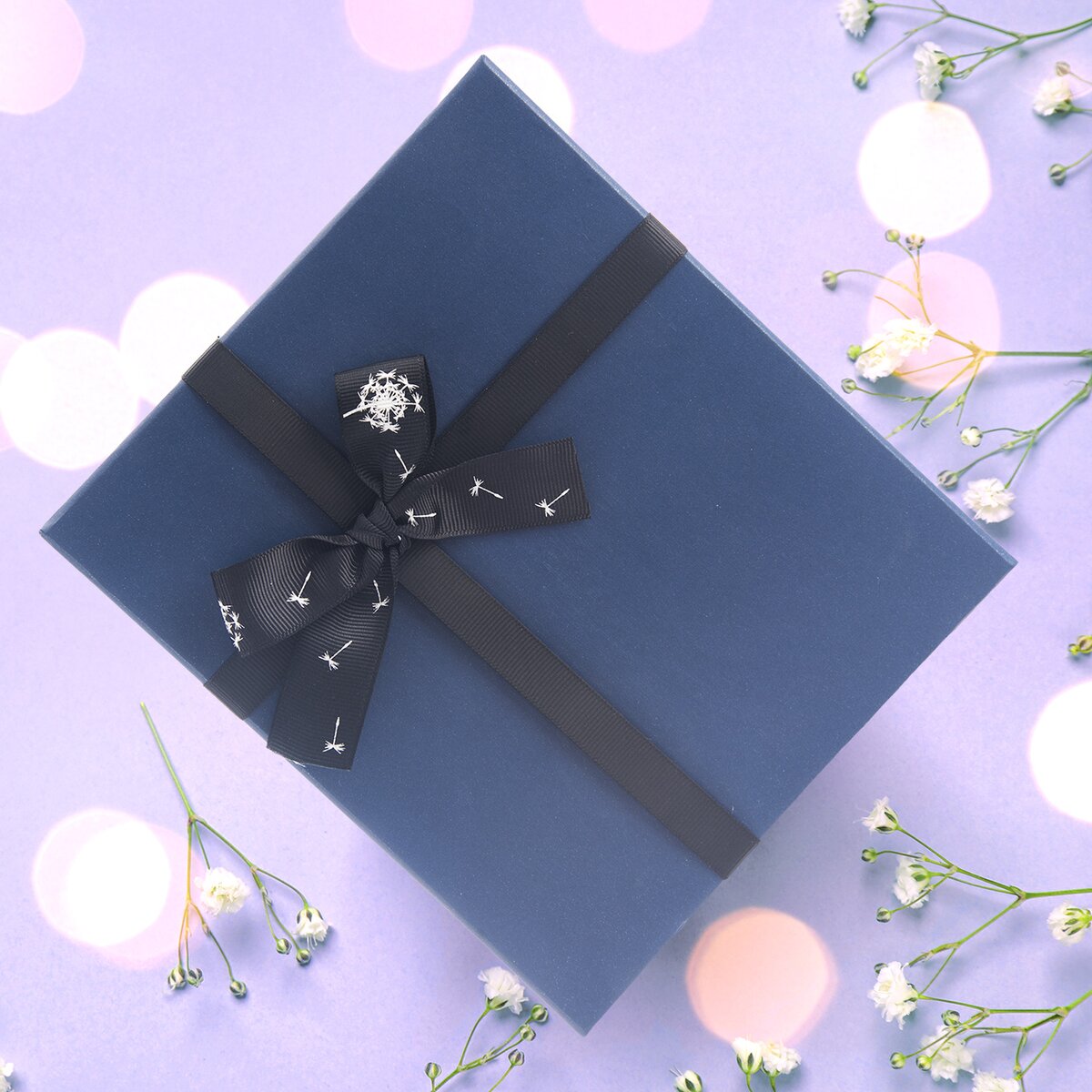 Kód produktu 822737Matná modrá krabice z kraftového papíru má na víku elegantní černou stuhu, zdobenou motivem chmýří z pampelišek. Určena k pohodlnému balení dárků.