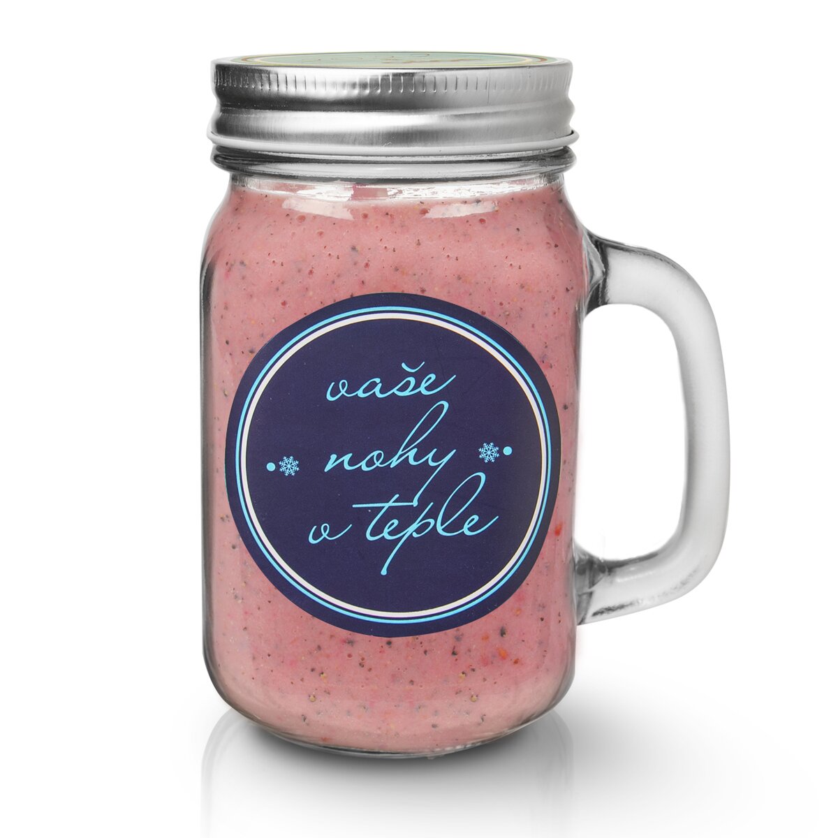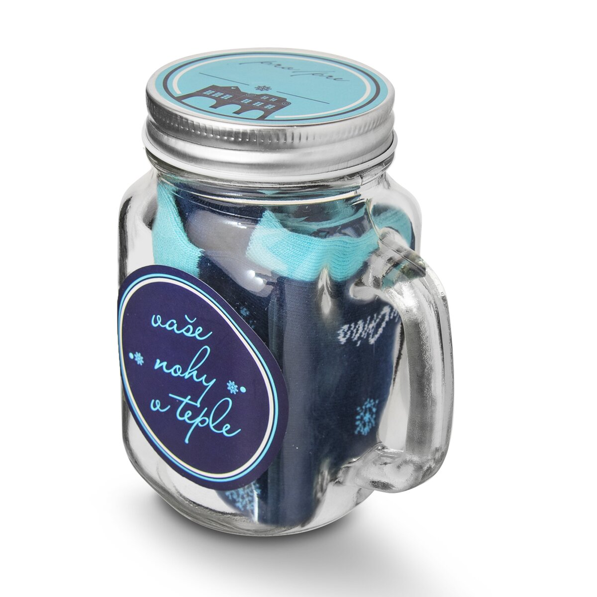 Sklenice s víčkem uvnitř ukrývá pár barevných ponožek. Skvělý a vtipný dárek. Skleničku s uchem můžete využít na vaše oblíbené nápoje, třeba smoothie nebo osvěžující limonádu, ale může posloužit také jako ukládací dóza na sušené ovoce, oříšky, bonbóny a jiné dobroty.