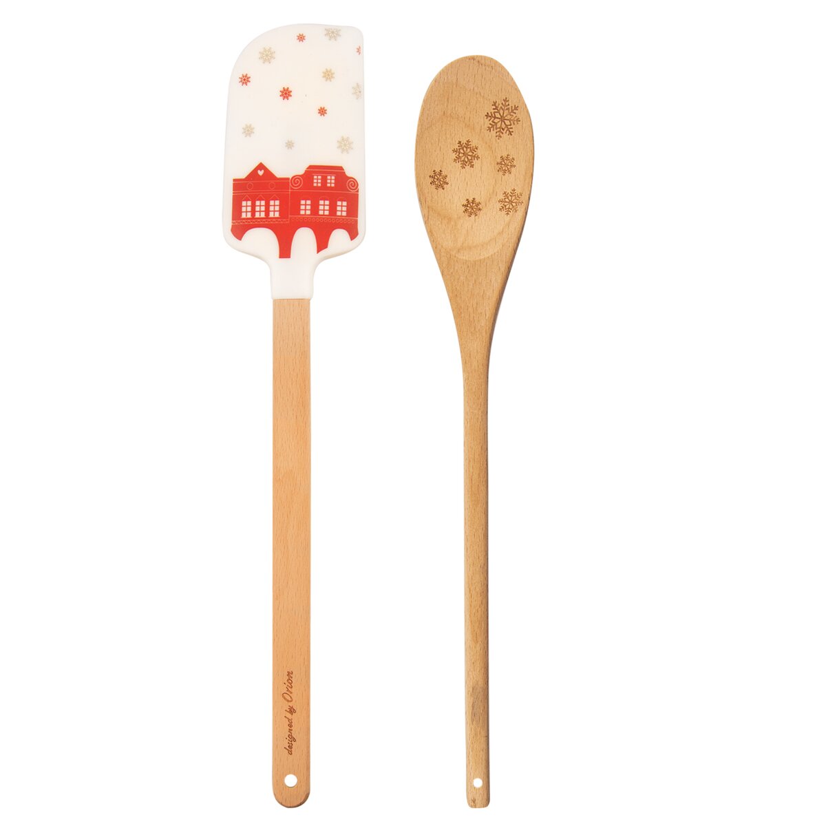 Kód produktu 142840Sada silikonové kuchyňské stěrky s vánočním motivem domků na bílém pozadí a dřevěné vařečky je vhodná jako zajímavý dárek pro nadšené i sváteční kuchaře a kuchařky.