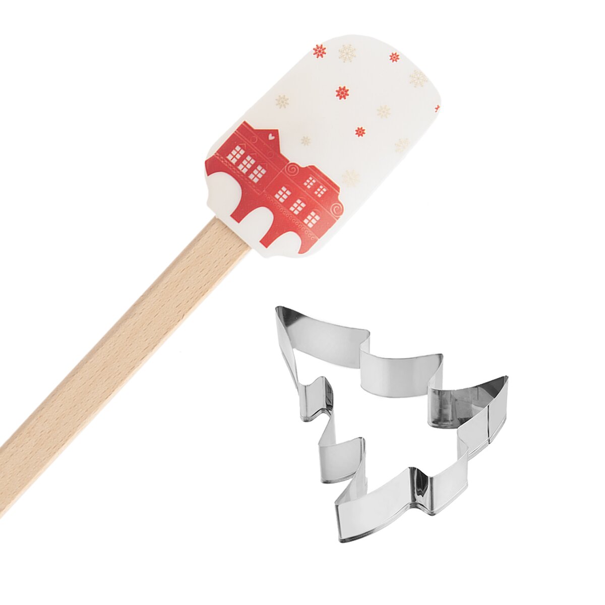 Kód produktu 142838Sada silikonové kuchyňské stěrky s vánočním motivem domků na bílém pozadí a vykrajovačky z pocínovaného plechu, vhodná jako zajímavý dárek.