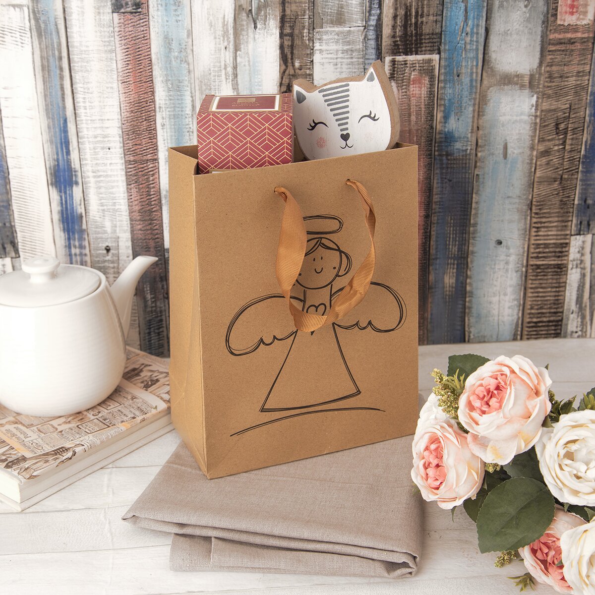 Dárek pro milovanou osobu, rodiče, kamarádku nebo kolegu v práci snadno uložíte bez složitého balení do papírové tašky s motivem anděla.