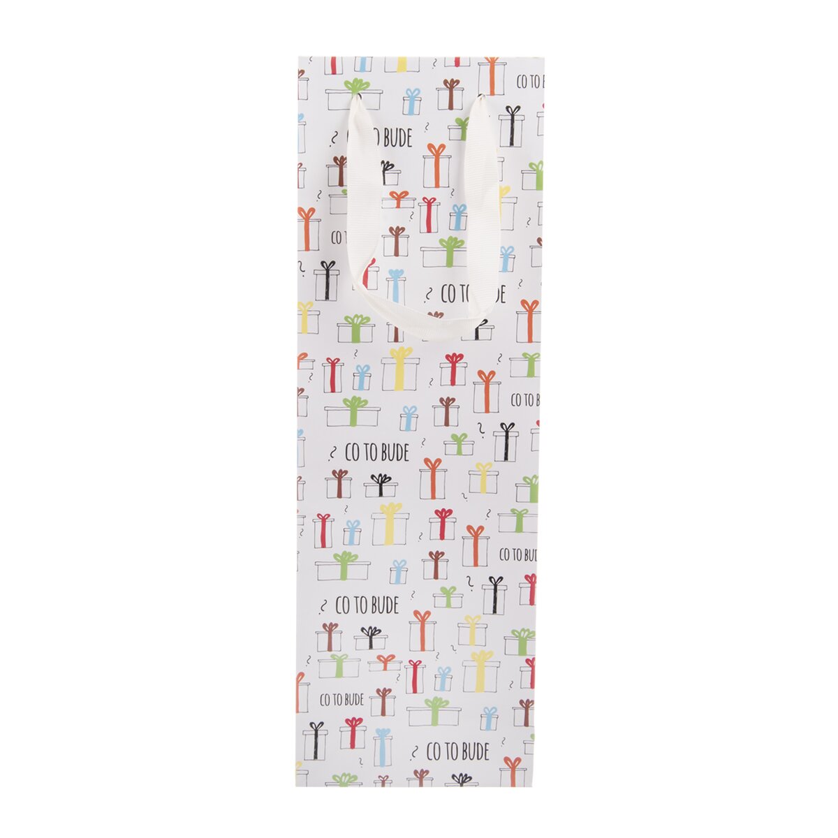 Užší dárková taška CO TO BUDE je skvělým místem k uložení dobrého vína, pálenky, oblíbeného likéru nebo domácí šťávy v zajímavé láhvi. Třeba pro partnera, kamarádku, kolegu, při narozeninách nebo výročí.