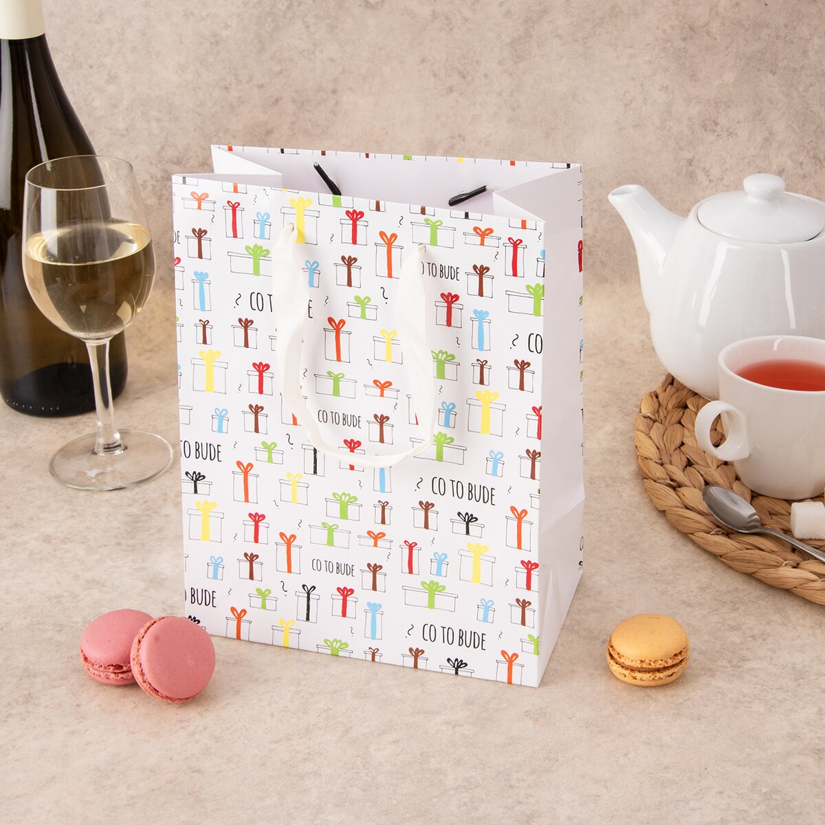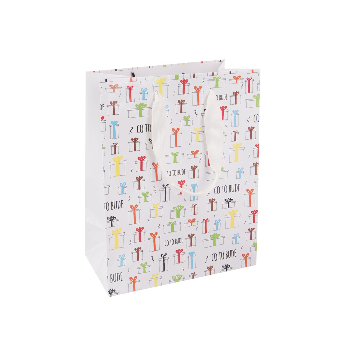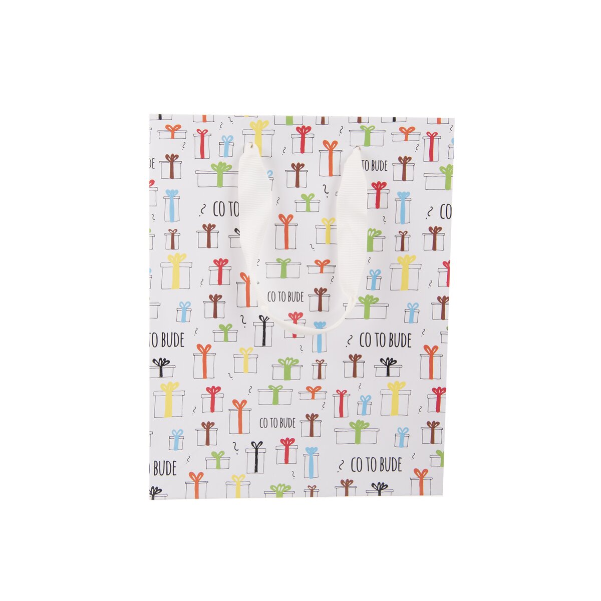 Kód produktu 822760Papírová dárková taška CO TO BUDE o rozměrech 18x10x23 cm s originálním potiskem je vhodná k uložení nejrůznějších dárků.