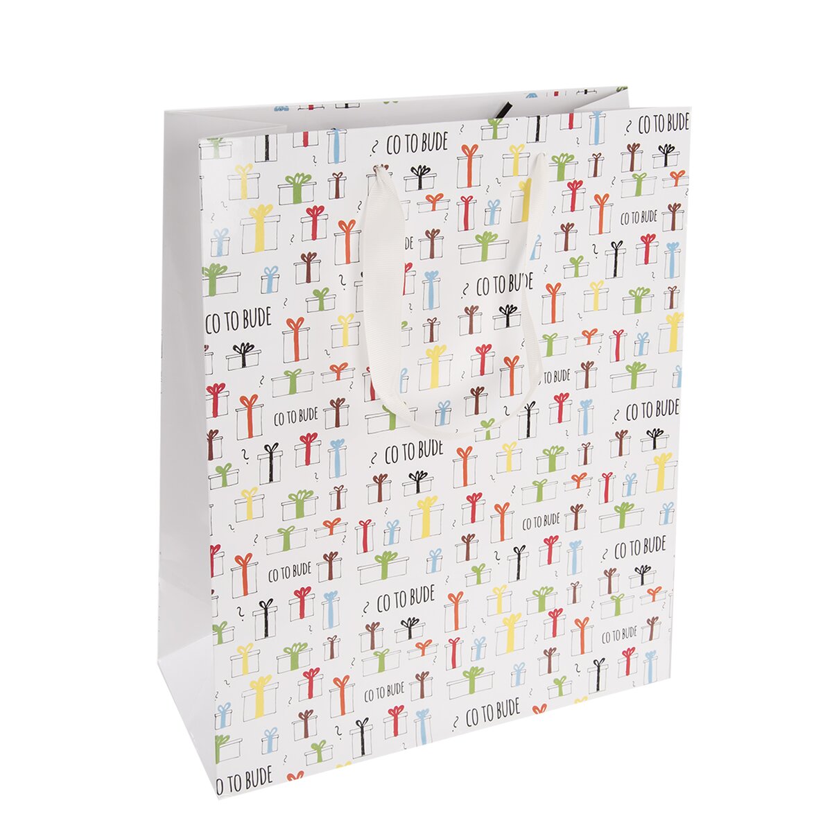 Kód produktu 822762Papírová dárková taška CO TO BUDE o rozměrech 26x12x32 cm s originálním potiskem je vhodná k uložení nejrůznějších dárků.