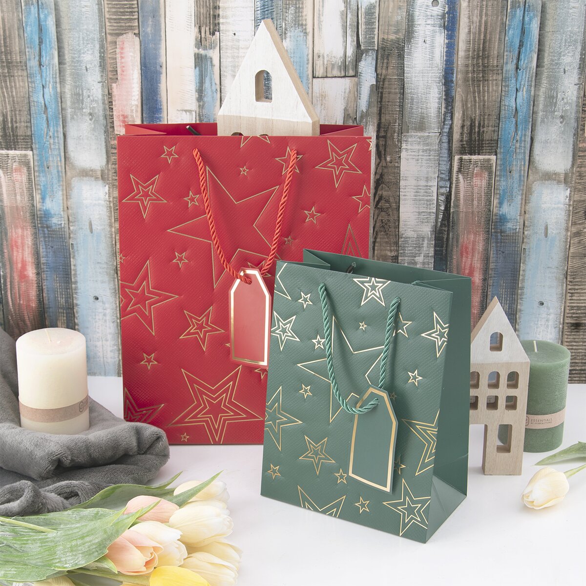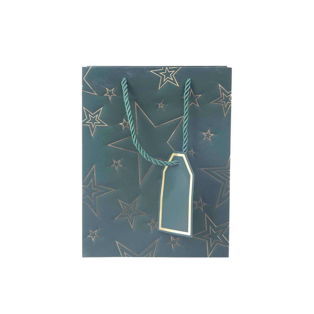Kód produktu 822744Menší papírová dárková taška o rozměrech 18x10x23 cm je v zeleném provedení, zdobená zlatými linkami hvězd.