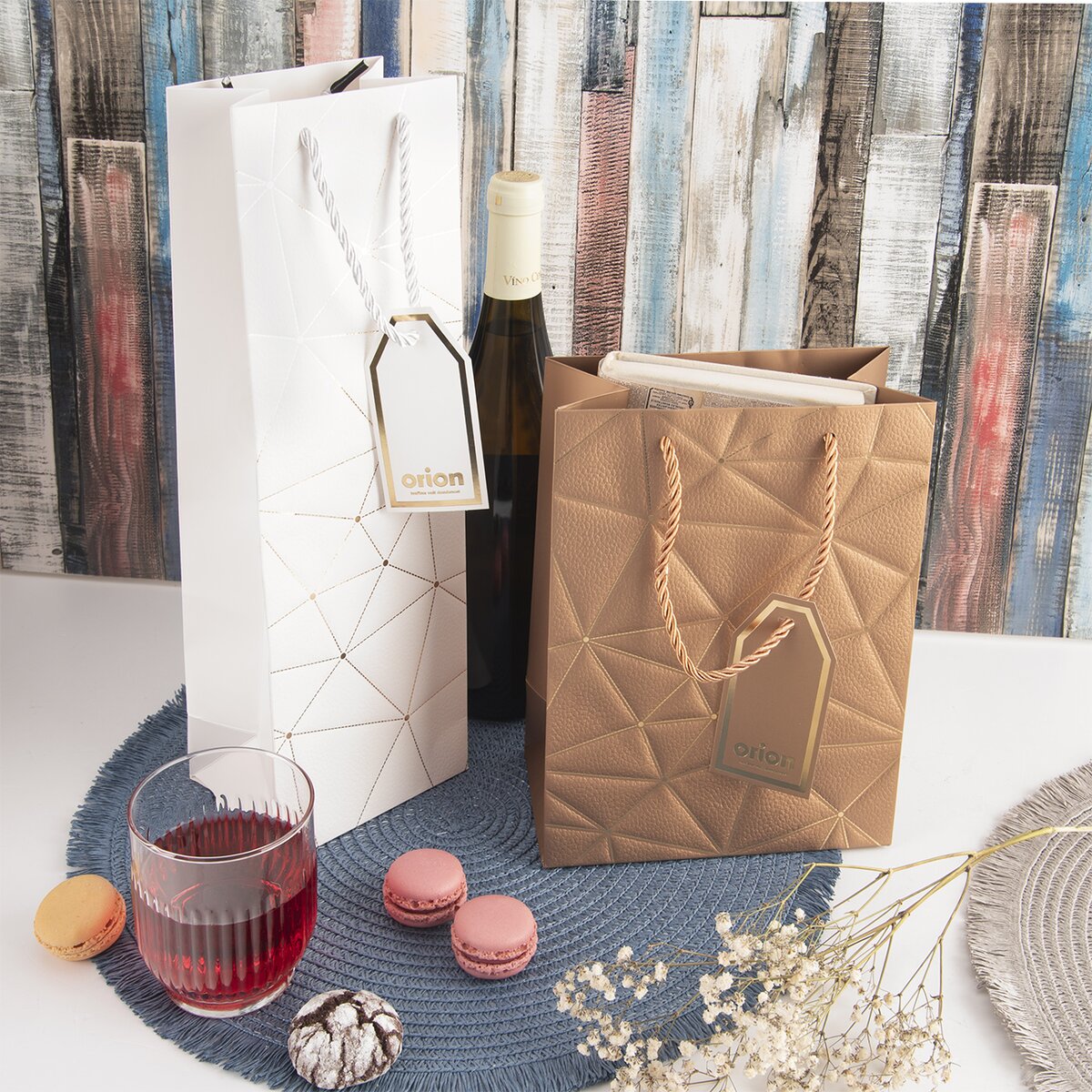 Elegantní, luxusně vypadající dárková taška je tím pravým místem k uložení láhve vína, domácího sirupu nebo dárků, které mají užší, podlouhlý tvar. Třeba při narozeninách nebo svatbě.