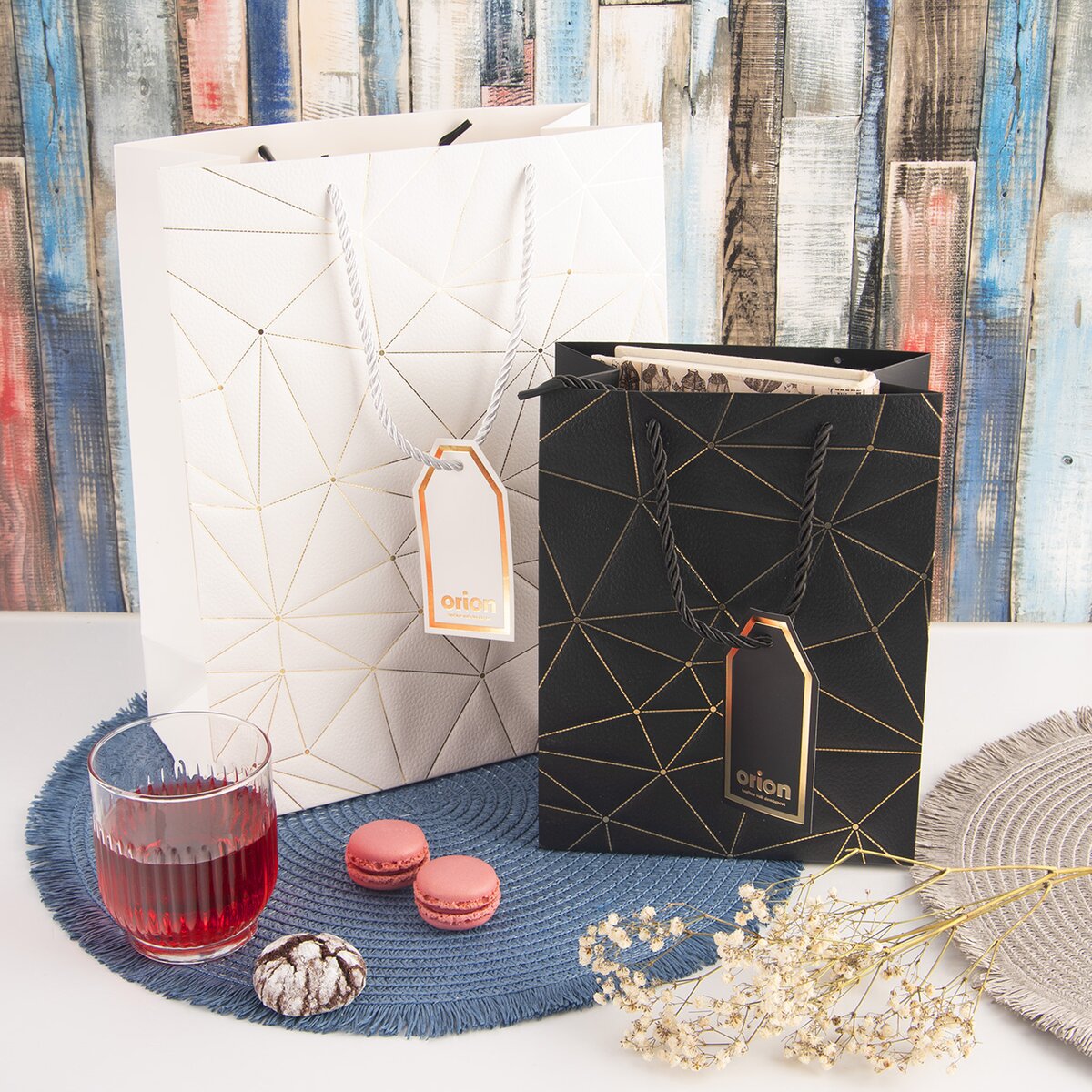 Na přední straně je zdobena zlatými linkami a doplněná jmenovkou, kam lze napsat věnování nebo jméno obdarovaného. S jejím přenášením pomohou držadla z krouceného polyesterového provázku.