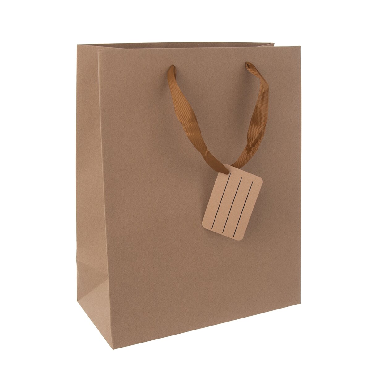 Každý dárek si zaslouží mít slušivé balení. Ať už jste koupili cokoliv, vložte vybraný dar do této větší papírové tašky. Její přírodní design umocňuje papírová cedulka s volným místem pro vypsání jména a mašle namísto ucha.