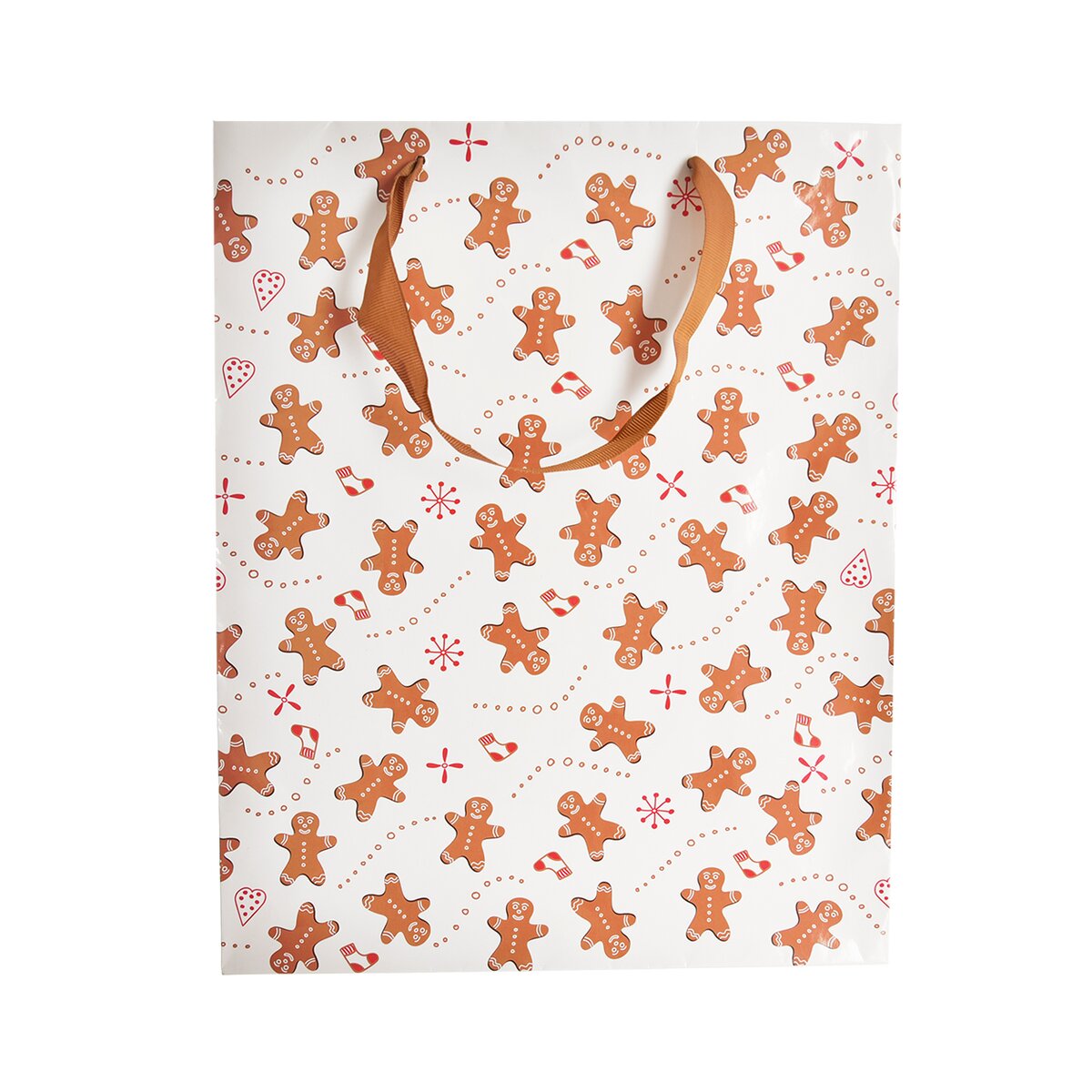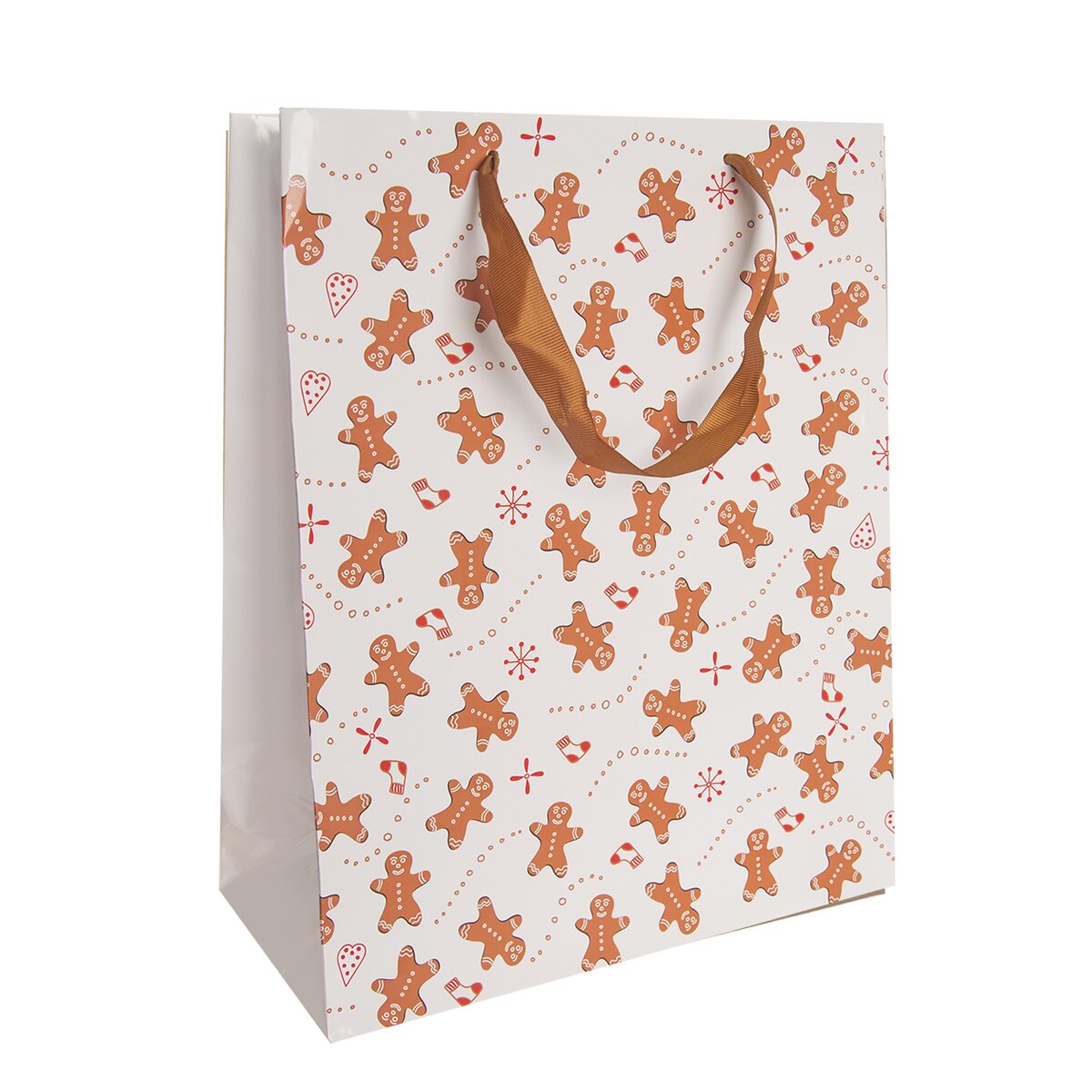 Kód produktu 822724Papírová dárková taška o rozměrech 26x12x32 cm s jemným dekorem perníčků.