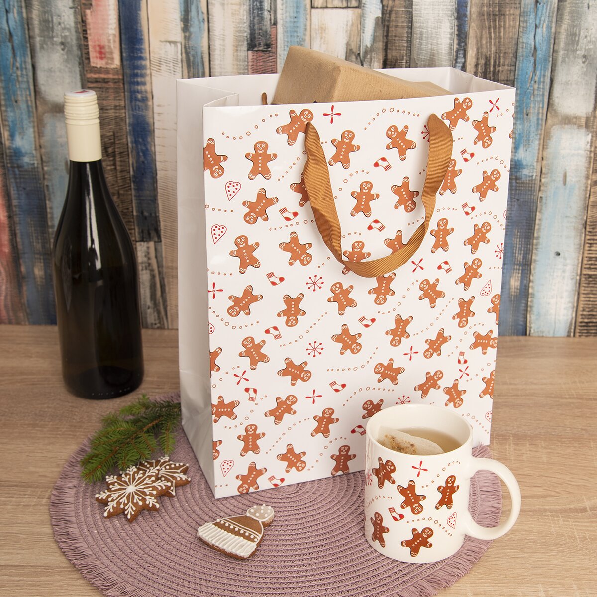 "Měkký dárek", láhev vína, kosmetické přípravky nebo balení nepravidelného tvaru nemusíte složitě balit do papíru. Stačí vše hezky uložit do větší papírové tašky s motivem perníčků.