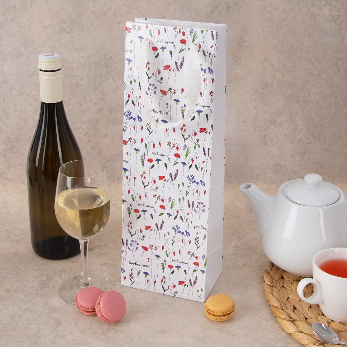 Užší dárková taška PŘEKVAPENÍ je skvělým místem k uložení dobrého vína, pálenky, oblíbeného likéru nebo domácí šťávy v zajímavé láhvi. Třeba pro partnera, kamarádku, kolegu, při narozeninách nebo výročí.