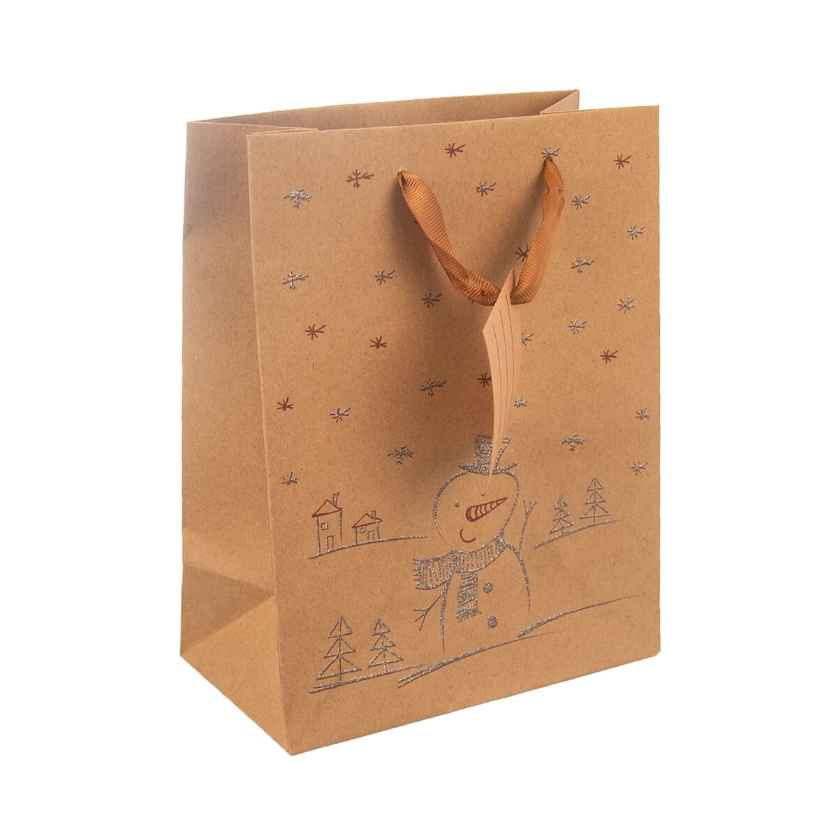 Papírová taška velikosti 18x10x23 cm zaujme svým jemným dekorem padajících vloček a sněhuláka. Taška má také papírovou cedulku s volným místem pro vypsání jména a mašli namísto ucha.