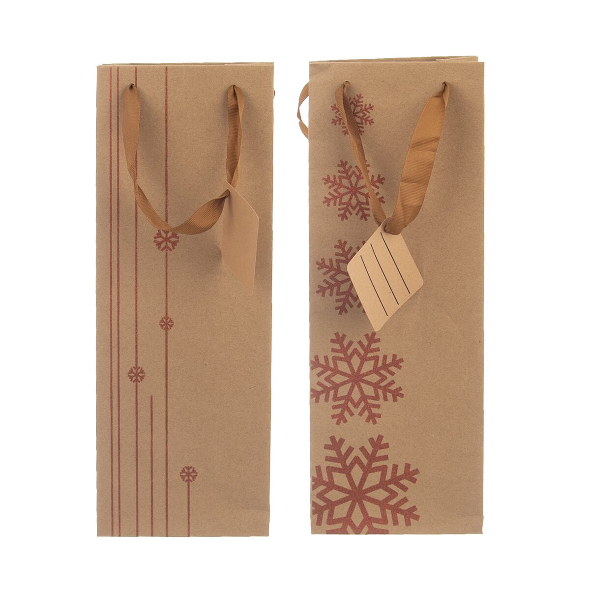 Jestliže dáváte jako dárek dobré víno nebo jinou lahvinku, vložte ji do této elegantní papírové tašky. Radost udělá i jemný dekor sněhových vloček. Taška má také papírovou cedulku s volným místem pro vypsání jména a mašli namísto ucha.